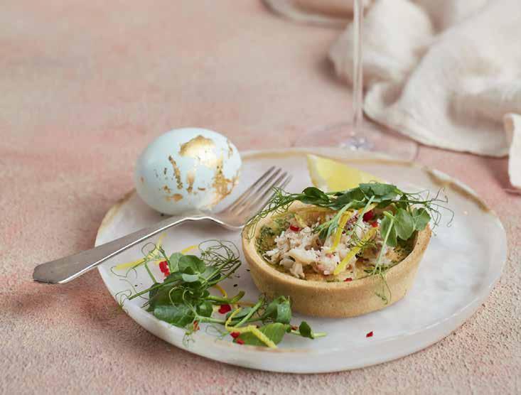 500g plain flour plus extra for dusting Sea salt and freshly ground black pepper 2 lemons, finely zested 250g unsalted butter, cold and cubed + 1 tablespoon 1 tablespoon ice cold water 6 Clarence Court Leghorn White eggs 6 spring onions, trimmed and finely sliced 50ml whole milk 200ml double cream 70g watercress, chopped (a few sprigs saved for garnish) 250g picked, white crab meat 1 fresh red chilli, de-seeded and finely chopped A handful of pea shoots to garnish Nyetimber’s Classic Cuvee Multi-Vintage, to serve