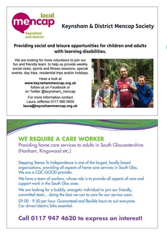 Have a look at www.keynshammencap.org.uk, follow us on Facebook Stepping Stones or To on Independence is one of the largest, locally based Twitter @keynsham_mencap. organisations, providing all aspects of home care services in South Glos. Forare more information contact Laura Jefferies 0117 986 5659 We a CQC GOOD provider.