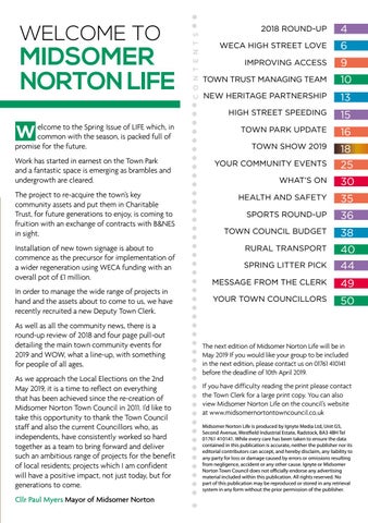 elcome to the Spring Issue of LIFE which, in common with the season, is packed full of promise for the future. Work has started in earnest on the Town Park and a fantastic space is emerging as brambles and undergrowth are cleared. The project to re-acquire the town’s key community assets and put them in Charitable Trust, for future generations to enjoy, is coming to fruition with an exchange of contracts with B&NES in sight. Installation of new town signage is about to commence as the precursor for implementation of a wider regeneration using WECA funding with an overall pot of £1 million. In order to manage the wide range of projects in hand and the assets about to come to us, we have recently recruited a new Deputy Town Clerk. As well as all the community news, there is a round-up review of 2018 and four page pull-out detailing the main town community events for 2019 and WOW, what a line-up, with something for people of all ages. As we approach the Local Elections on the 2nd May 2019, it is a time to reflect on everything that has been achieved since the re-creation of Midsomer Norton Town Council in 2011. I’d like to take this opportunity to thank the Town Council staff and also the current Councillors who, as independents, have consistently worked so hard together as a team to bring forward and deliver such an ambitious range of projects for the benefit of local residents; projects which I am confident will have a positive impact, not just today, but for generations to come. Cllr Paul Myers Mayor of Midsomer Norton