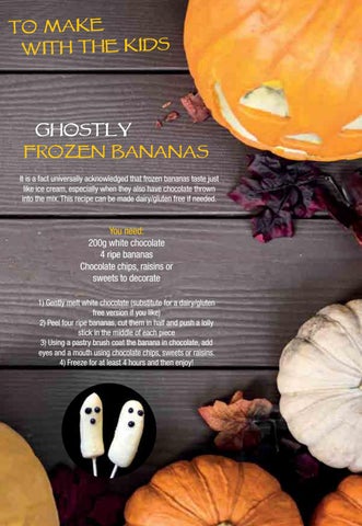 You need: 200g white chocolate 4 ripe bananas Chocolate chips, raisins or sweets to decorate 1) Gently melt white chocolate (substitute for a dairy/gluten free version if you like) 2) Peel four ripe bananas, cut them in half and push a lolly stick in the middle of each piece 3) Using a pastry brush coat the banana in chocolate, add eyes and a mouth using chocolate chips, sweets or raisins. 4) Freeze for at least 4 hours and then enjoy!