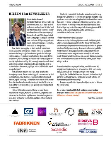 HILSEN FRA STYRELEDER Nå skal det danses! For å gå rett på sak, så tror jeg det jeg gleder meg mest til på årets festival, er å danse lørdags kveld til Baba Soul og the Professors of Funk! Jeg husker ennå den fantastiske stemningen på konserten deres i 2016, da gulvet på Cafè Stift gynget og duggen silte nedover vinduene. Nå byr de opp til dans igjen, men denne gangen i Festsalen, med plass til mange flere. Da vi startet planlegging av årets festival, var det med en viss usikkerhet om hvordan oktober ville se ut i pandemiverdenen. Erfaring fra fjorårets festival gjorde det hele mye enklere, og med et dedikert og arbeidsomt styre, og et dyktig programråd, har vi planlagt en festival vi er stolte av å presentere. Og vi gleder oss veldig til å kunne gjennomføre en festival under mere normale omstendigheter. Det med stor glede at vi sier «hadet» til meteren, og håper vi ikke må forholde oss til hverandre igjen! Årets program er større enn i fjor, med 15 konserter i Hovedprogrammet. Det er variert og godt sammensatt, og skal favne de fleste. Hovedarenaen vår er som alltid Kulturhuset Banken, og i år har vi også hele 3 konserter i vakre Lillehammer Kirke. Jazzincubator har sine konserter på Scandic Victoria, og med det har vi en festival med alle spillesteder i fin gåavstand til hverandre! I tillegg til Hovedprogrammet har vi på plass Barnehagekonsert, Ungjazz, Kulturell Spaserstokk, Ungdomsskolekonserter, JazzIncubator, og ikke minst Jazzparaden gjennom byen. Vi er så klare for en folkefest, og håper at flest mulig vil være med oss!