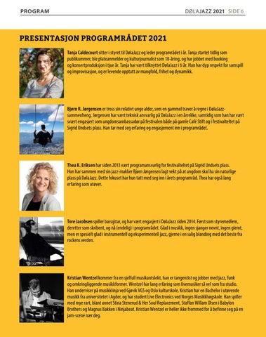 PRESENTASJON PROGRAMRÅDET 2021 Tanja Caldecourt sitter i styret til DølaJazz og leder programrådet i år. Tanja startet tidlig som publikummer, ble plateanmelder og kulturjournalist som 18-åring, og har jobbet med booking og konsertproduksjon i tjue år. Tanja har vært tilknyttet DølaJazz i ti år. Hun har dyp respekt for samspill og improvisasjon, og er levende opptatt av mangfold, frihet og dynamikk.