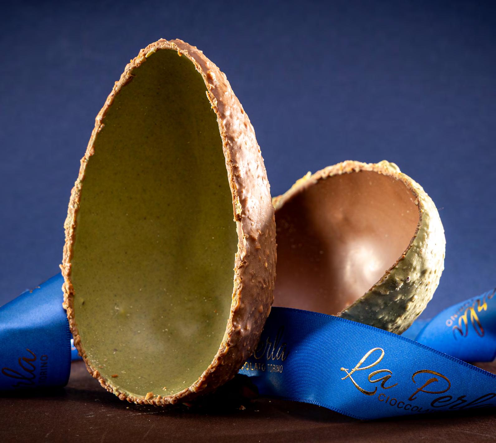 Uovo bicolore al pistacchio e cioccolato al latte con pasta Kataifi “La Perla” (Piemonte)