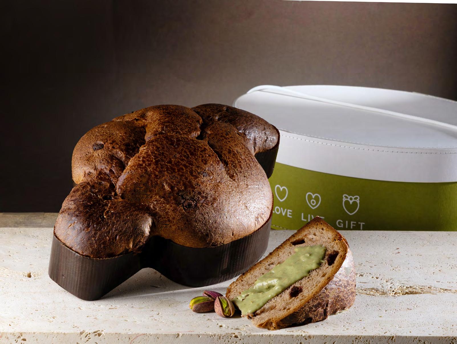 Colomba Artigianale con pepite di cioccolato al pistacchio con glassa al pistacchio / 72 ore di lavorazione “Satri” in scatola con guaina “Love Live Gift” (Umbria)