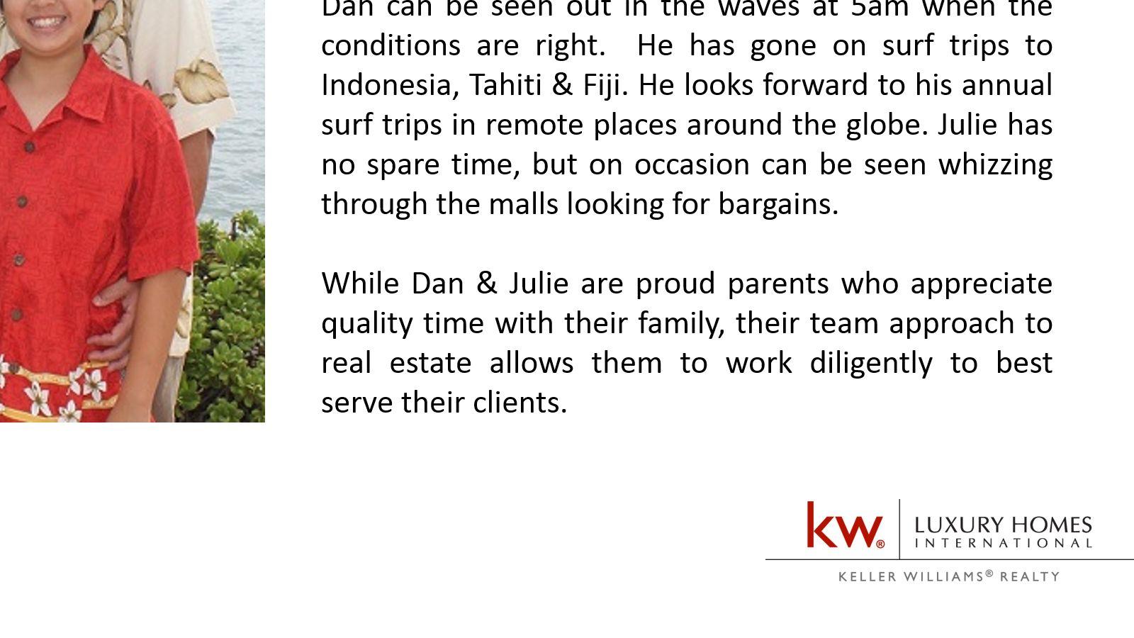 Dan & Julie have been married for over 35 years and have 3 sons: Michael (29), James (26) and Randy (24). Randy and James work with The Ihara Team as the Listing Specialist and Listing Manager, respectively. When not studying and working they can be found surfing or diving with their friends and dad.