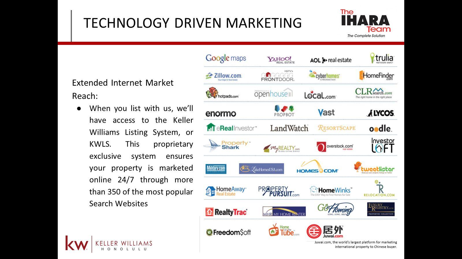 ●Millions of Buyers across North America with the Keller Williams Mobile Application will be able to find your property with a few clicks! More Buyers equals more opportunities, which drives competition for your property.