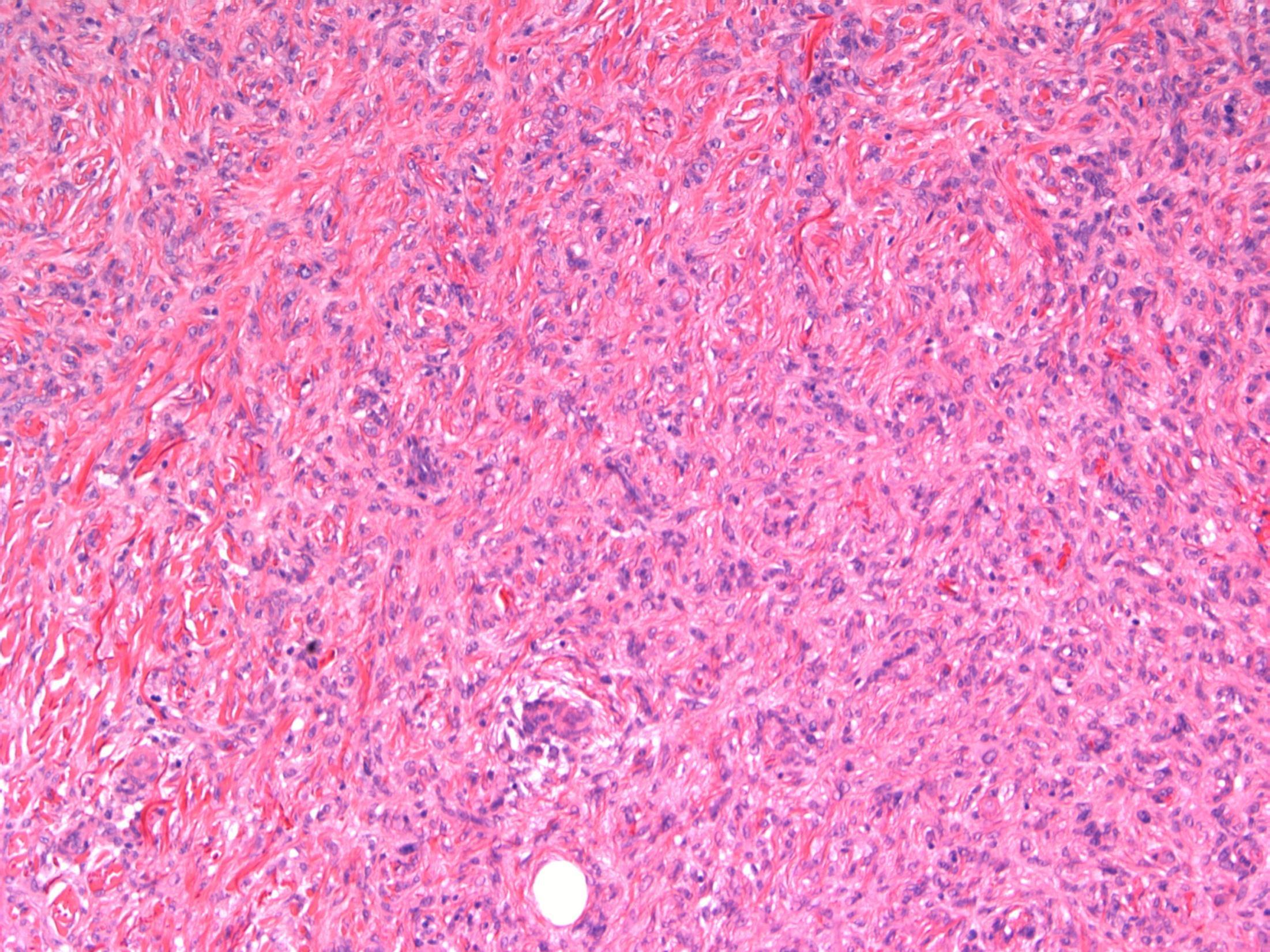 Description: Pseudoepitheliomatous hyperplasia of the overlying epidermis. In dermis –short fascicles of spindle cells with individual collagen bundles surrounded by lesional cells at the periphery; giant cells, macrophages, inflammatory cells. Focal extension to subcutis.