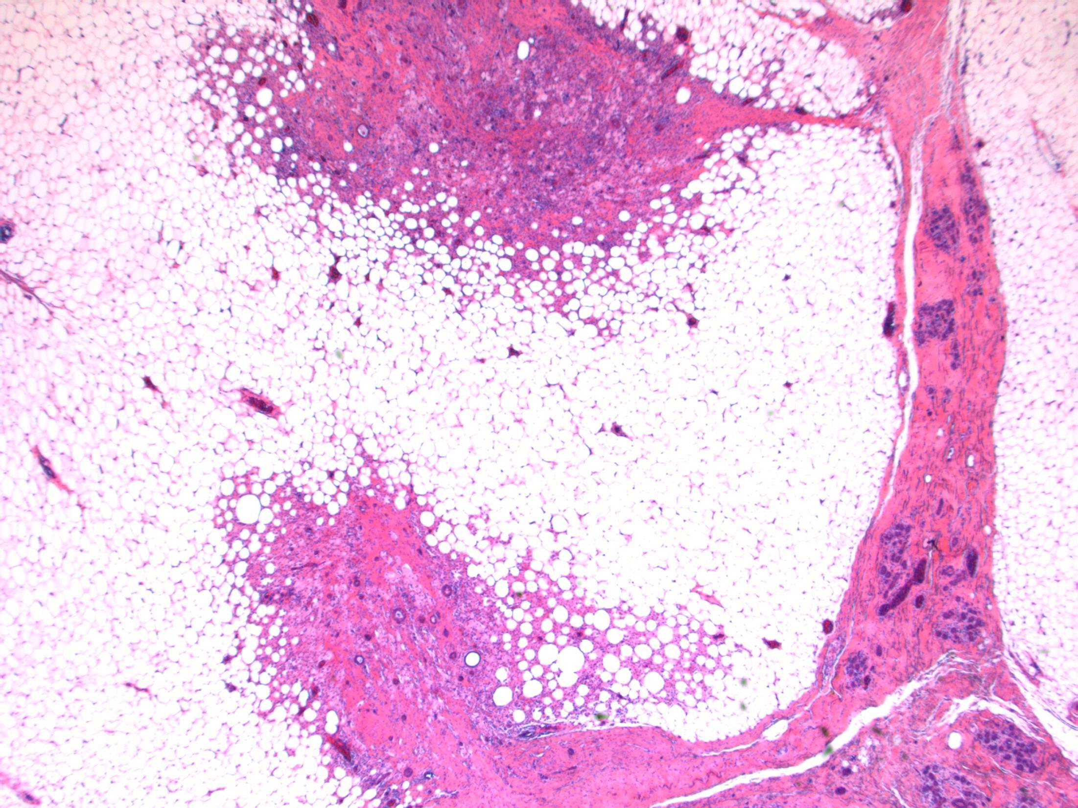 • Breast – High grade DCIS + displaced epithelium + silicone granuloma