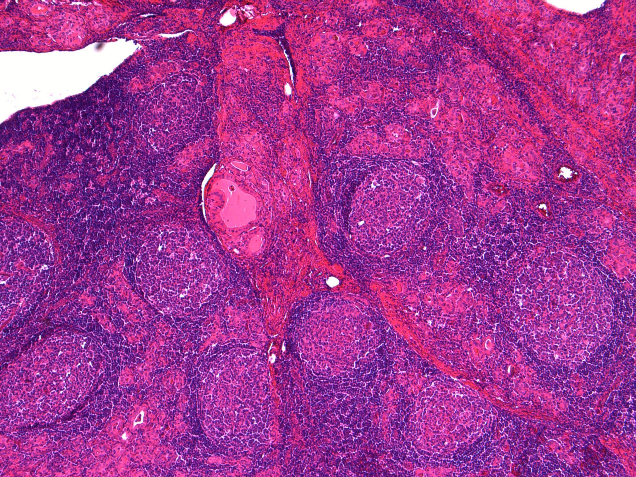 Description: Abrupt transition between tumour and epithelium. Plump papillary invaginations of thickened and infolding epithelium, hyperkeratosis. Lack of cytological atypia, suprabasal mitoses. Retraction of normal epithelium at margin. Diagnosis: Verrucous carcinoma Differential Diagnosis: