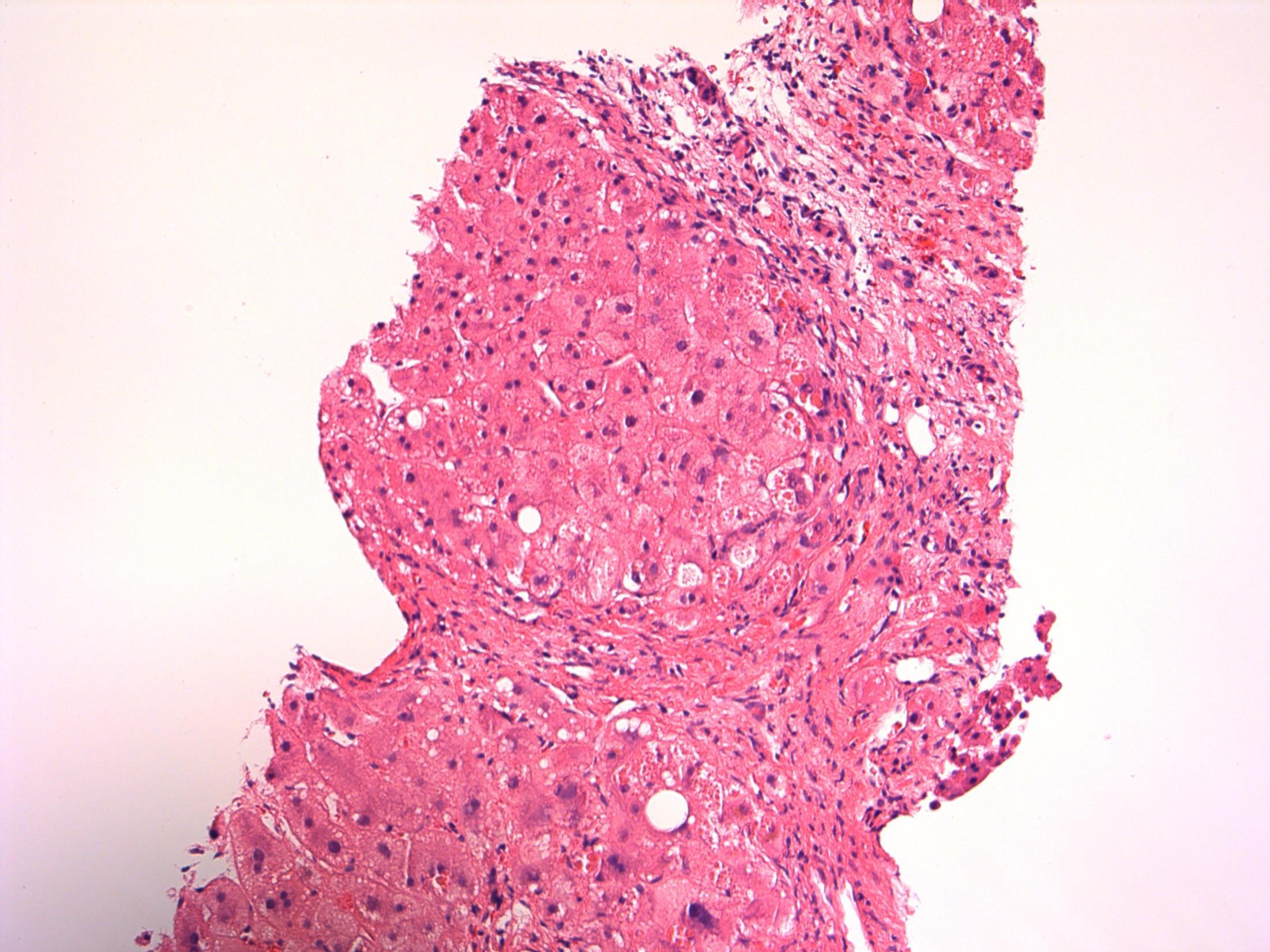 Description: Nodules of hepatocytes surrounded by fibrovascular septae. There is ductular reaction and inflammation of varying degrees. Mild steatosis. Also oval cytoplasmic eosinophilic globular inclusions in periportal hepatocytes.