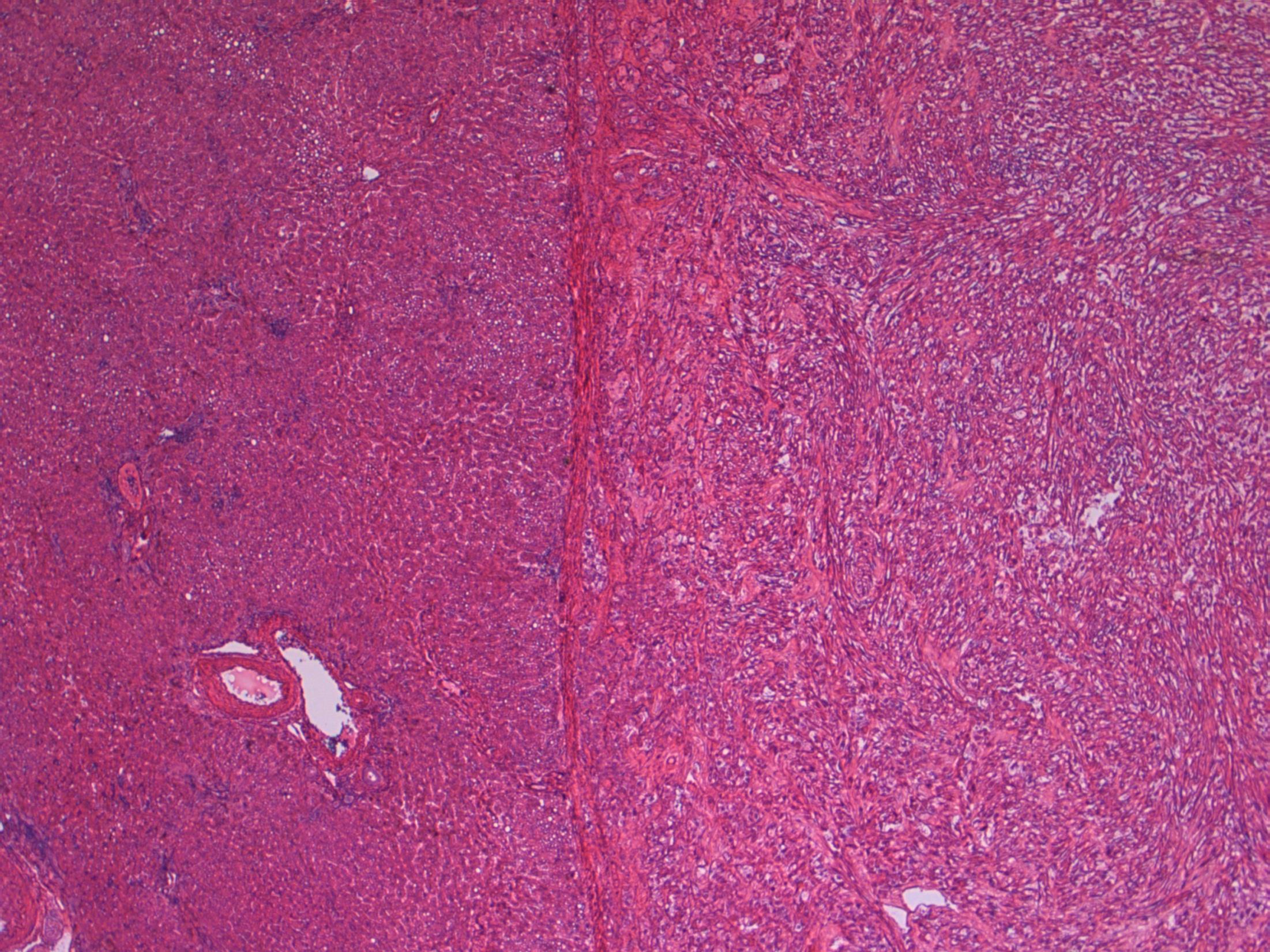 • Fibroma/ fibrothecoma. May show marked oedema but tumour usually replaces entire ovary with no sparing at edges.