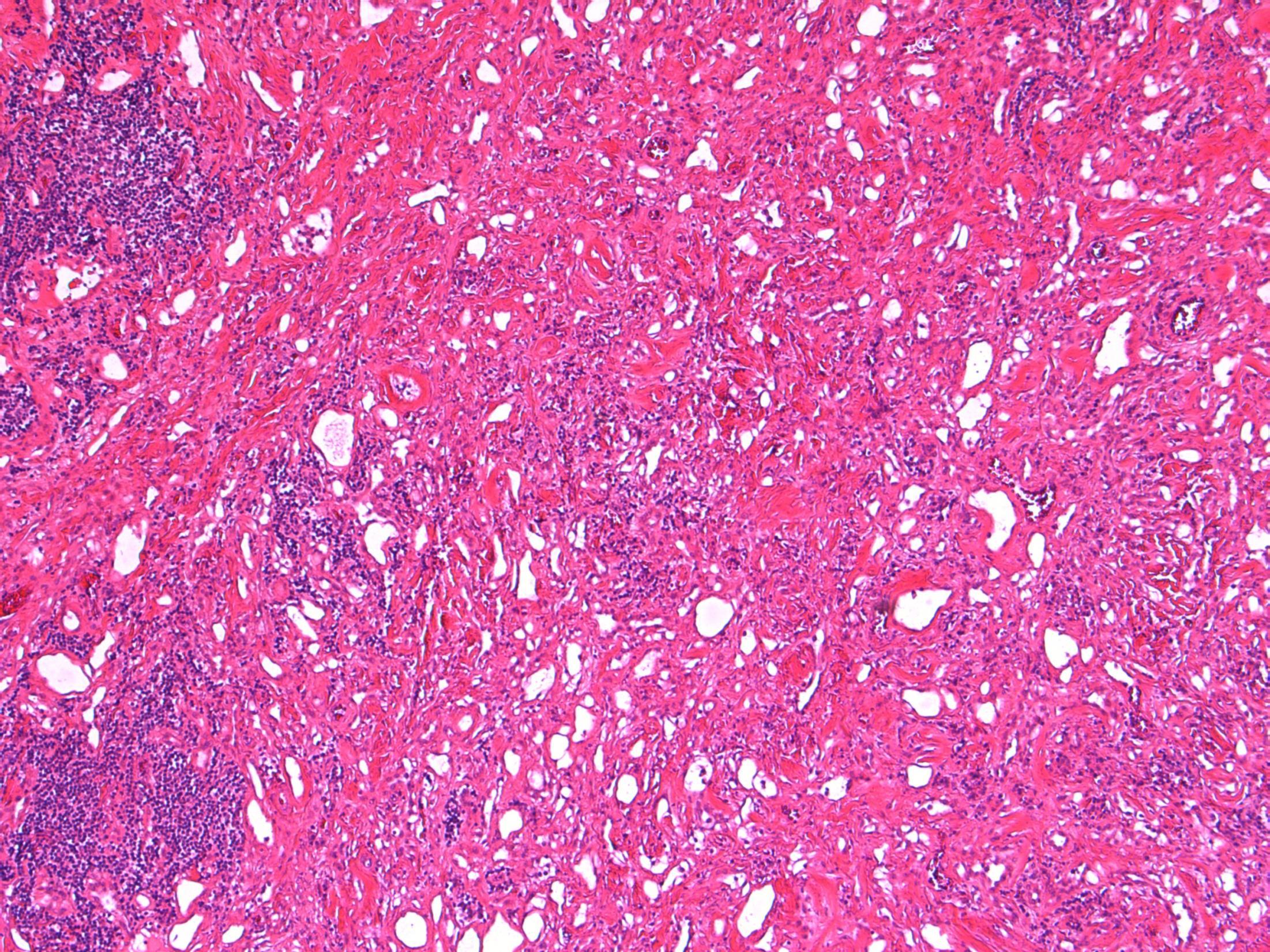 tumour Description: Well cirumscribed tumour with glandular/vascular type structures with vacuolated cytoplasm within fibro-muscular stroma, reactive lymphoid aggregates at periphery. No mitoses, no necrosis. Diagnosis: Adenomatoid tumour Plan: IHC: mesothelial markers calretinin+ AE1/3+ Comments: • Most common paratesticular neoplasm, including epididymis, like in this case • Mesothelial in origin; benign • Wide spectrum of growth patterns – tubular, solid, cystic, angiomatoid • Differential Diagnosis : – Adenocarcinoma (BerEp4/ MOC31+) – Malignant mesothelioma (necrosis/ mitoses/ more infiltrative)