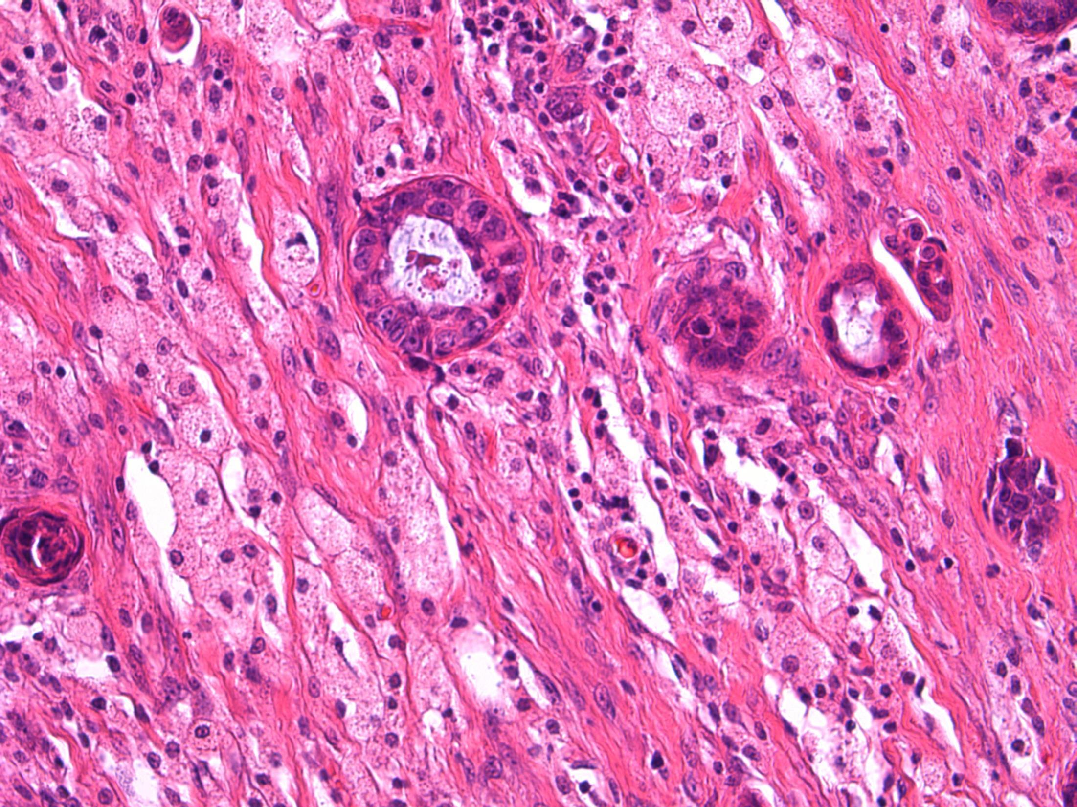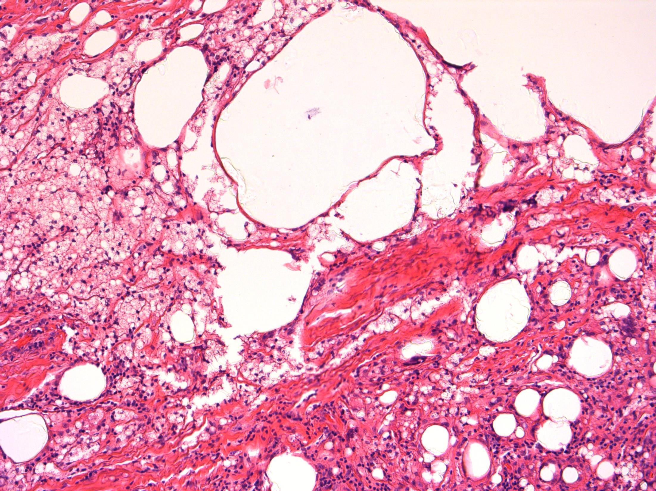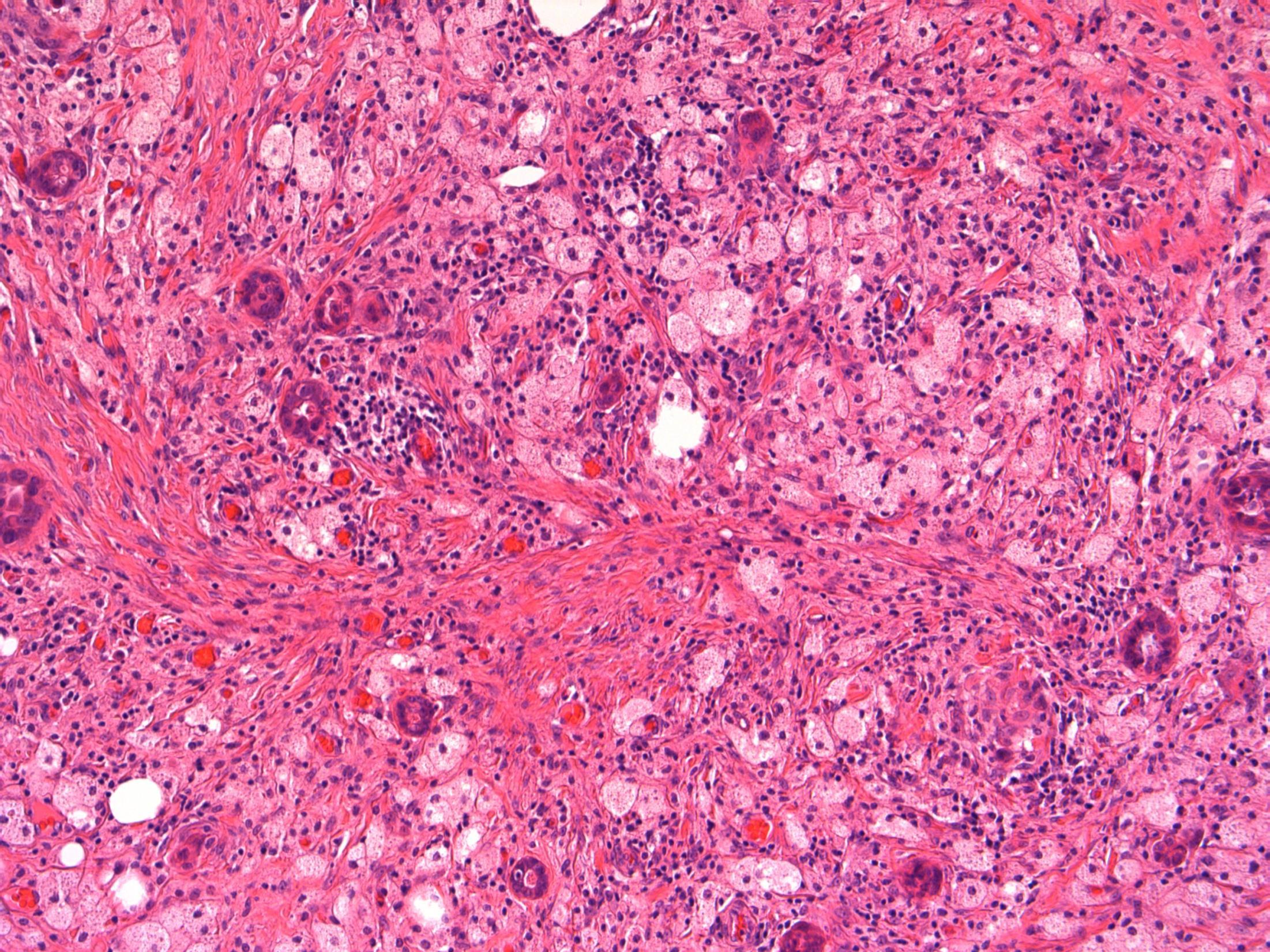 Description: Sheets of large polygonal cells with eccentric nuclei and abundant granular eosinophilic or vacuolated cytoplasm.