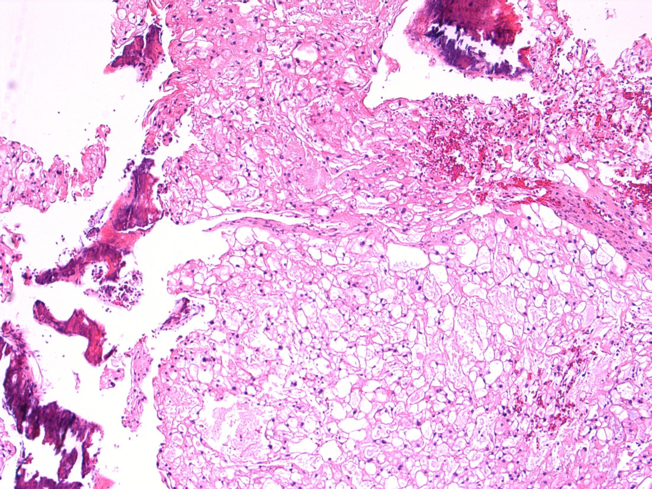 Description: lobulated tumour, physaliferous cells with vacuolated cytoplasm, myxoid stroma, considerable variability. Infiltrates bone. Diagnosis : Chordoma Or Favoured Diagnosis: Chordoma Differential diagnosis • Metastatic carcinoma • Clear cell carcinoma (minor salivary gland) • Lipomatous tumour Plan: IHC- chordoma is S100, vimentin, AE1/3, brachyury positive. Difficult case –Needs expert opinion and clinical/radiological correlation. Comments: Commonest in sacral spine (60%), but spheno-occipital/nasal is second commonest site (25%) like in this case. Low - intermediate malignant potential.