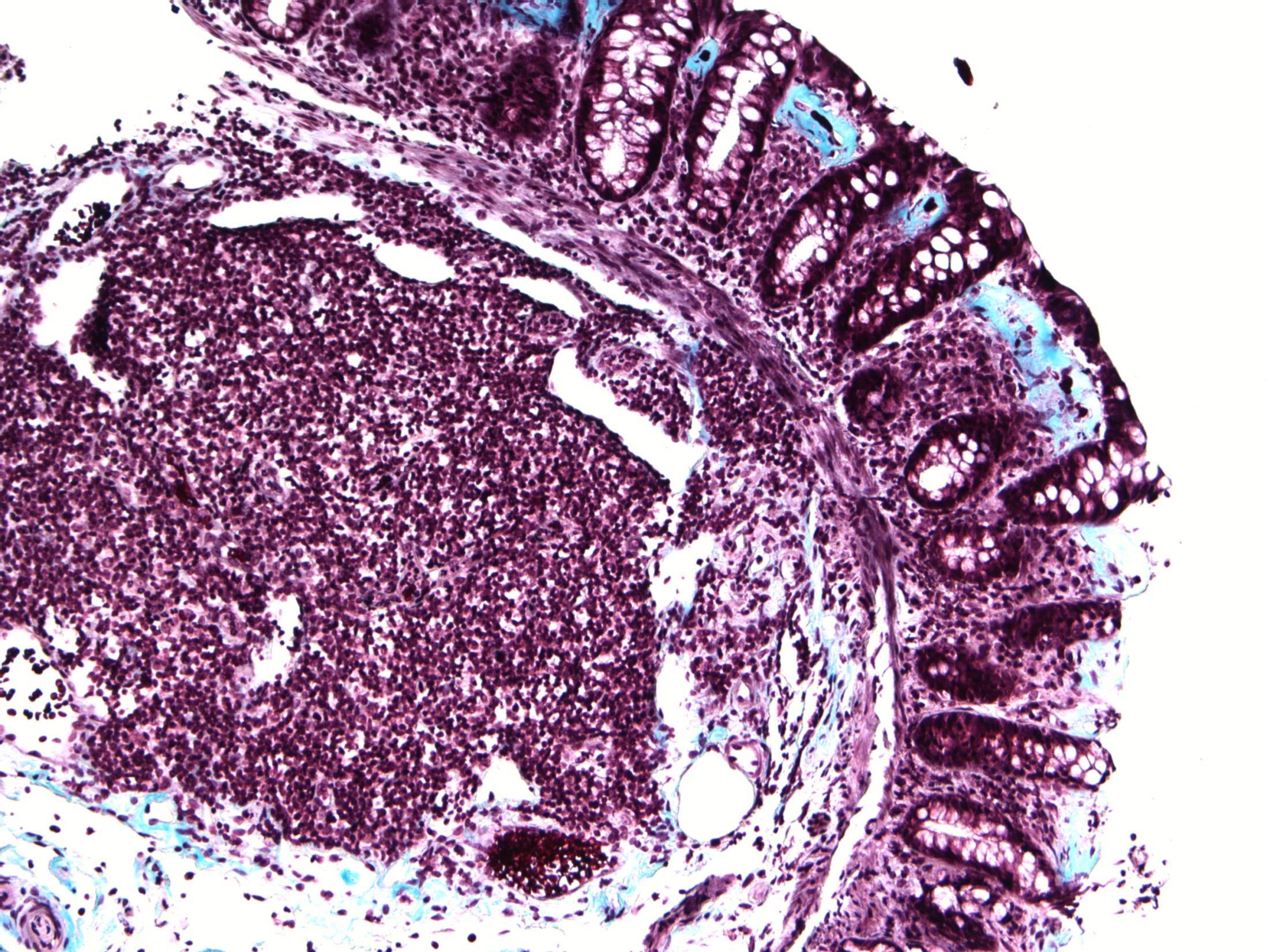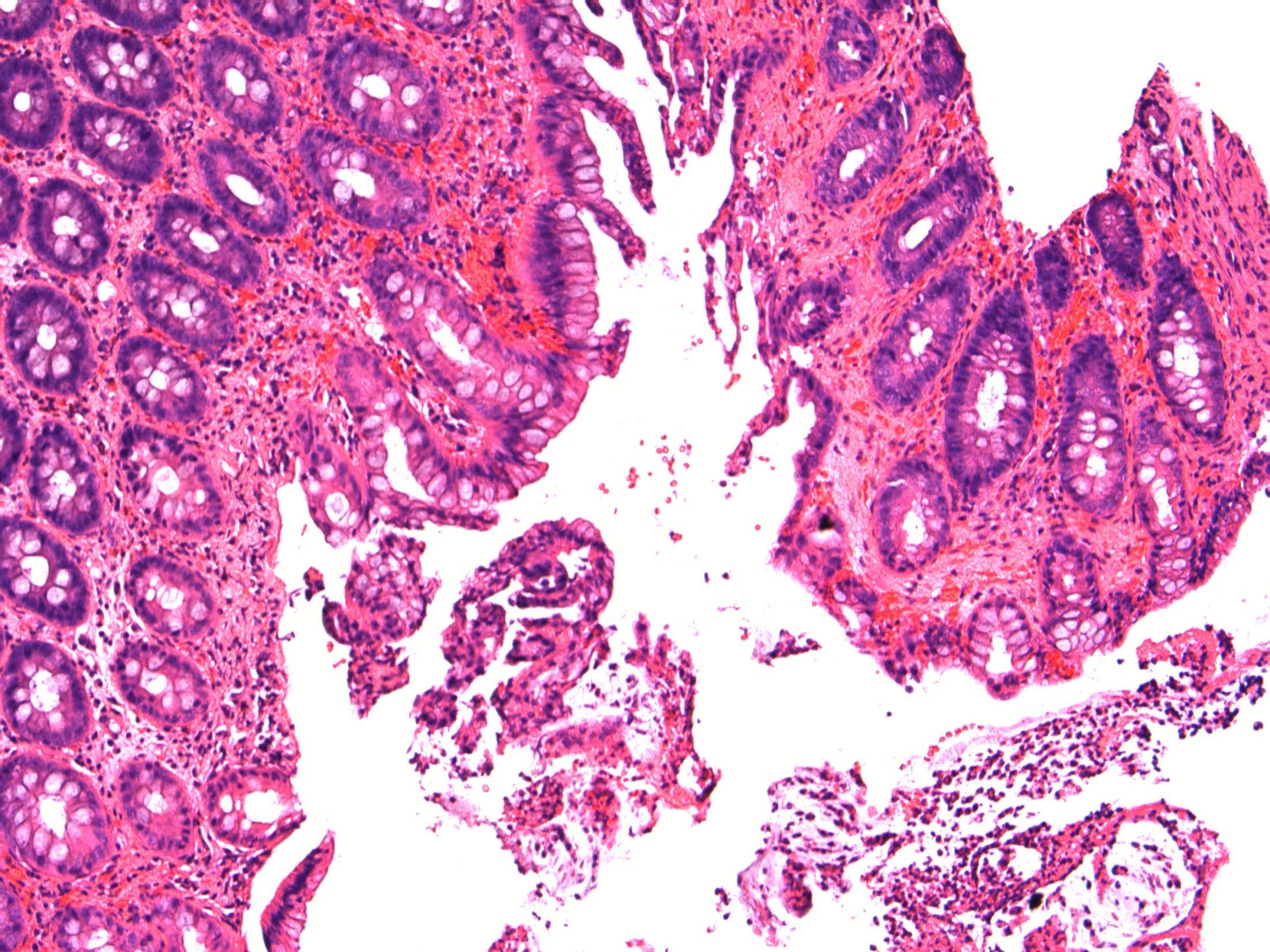 62F, with asthma, recently discharged from hospital after treatment for severe pneumonia. Now has sudden onset bloody diarrhoea and abdominal pain. Biopsy from sigmoid colon.