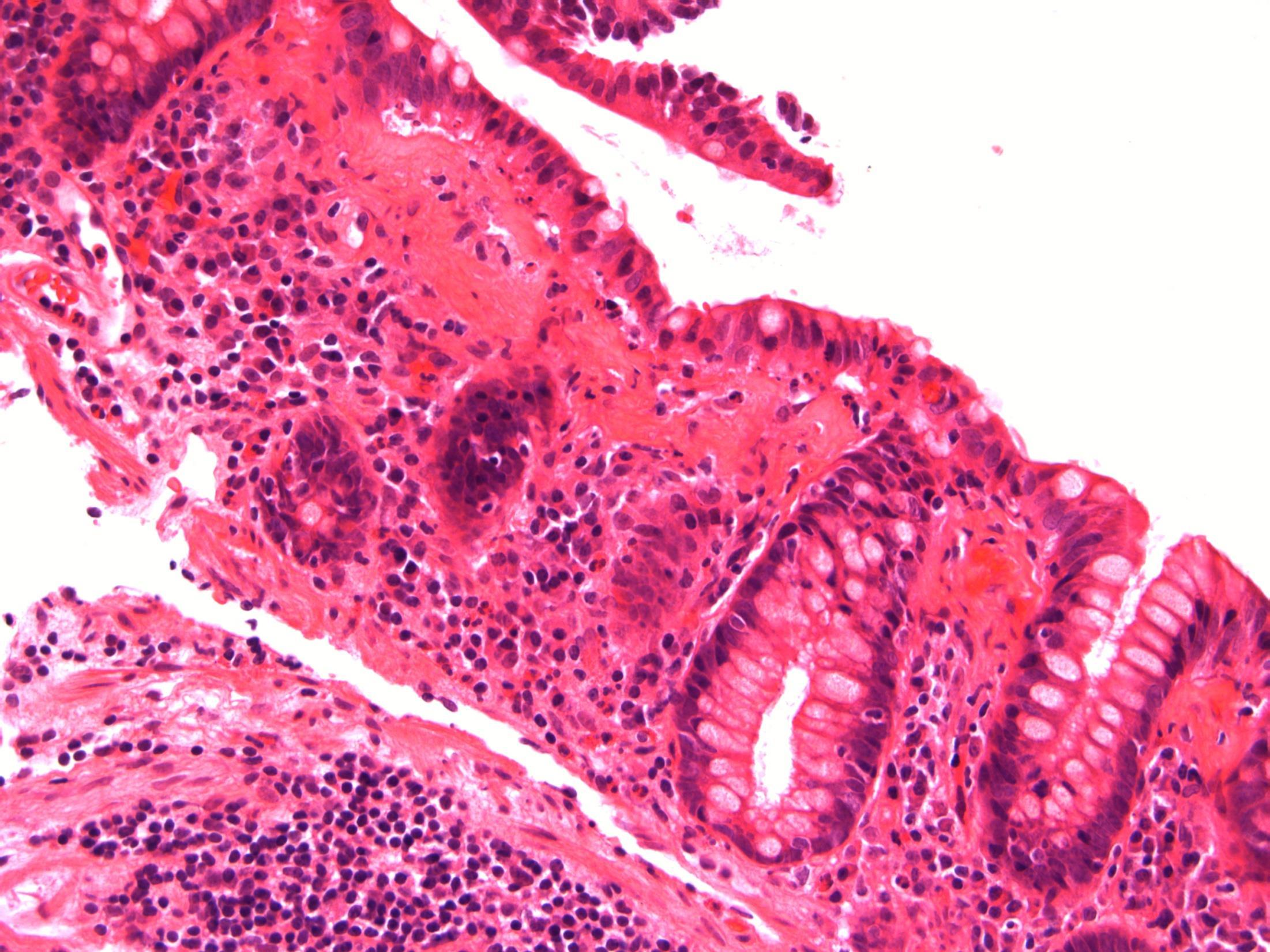 71F. Abdominal pain and diarrhoea. Upper GI endoscopy normal. D2 biopsy taken to exclude coeliac disease