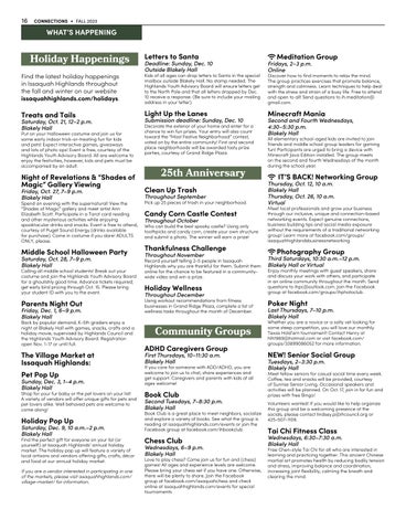 PRSRT STD U.S. POSTAGE PAID ISSAQUAH, WA PERMIT NO. 83 2550 NE Park Drive Issaquah, WA 98029 ECRWSS POSTAL PATRON Inside This Issue FALL 2023 | FREE 3 Directory 4-6 Feature: Good Neighbors 8-9 Special: Veterans Day 11 Development Update 12-13 Homeowners Association 15 School Spotlight 16-17 What’s Happening 19 Highlands Council 20 Highlands Youth 23 Art Gallery 24 Garden 27 Volunteers of the Month 28 Emergency Prep 29 Fiber Network 30 On the Blog 31 Summer Recap