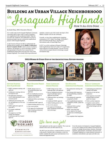 How It All Gets Done by Sarah Hoey, IHCA Executive Director Ever wonder what role the Issaquah Highlands Community Association (IHCA) plays when it comes to building a new neighborhood with a production builder? Many do not realize the complexity and collaboration involved in planning and approving new construction neighborhood projects within Issaquah Highlands. As the Executive Director for IHCA, I administrate the building process together with the Builder Architectural Review Committee (BARC) which consists of architects, engineers, and designers, as well as developers, builders, and representatives from the City to ensure the new neighborhood design follows the spirit and vision of the Issaquah Highlands. This includes following architectural