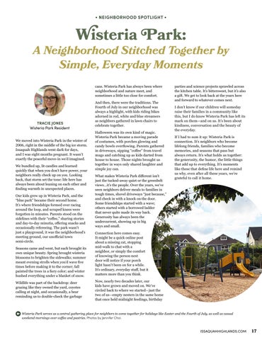TRACIE JONES Wisteria Park Resident We moved into Wisteria Park in the winter of 2006, right in the middle of the big ice storm. Issaquah Highlands went dark for days, and I was eight months pregnant. It wasn’t exactly the peaceful move-in we’d imagined. We bundled up, lit candles and learned quickly that when you don’t have power, your neighbors really check up on you. Looking back, that storm set the tone: life here has always been about leaning on each other and finding warmth in unexpected places. Our kids grew up in Wisteria Park, and the “blue park” became their second home. It’s where friendships formed over racing around the loop, and scraped knees were forgotten in minutes. Parents stood on the sidelines with their “coffee,” sharing stories and day-to-day minutia, offering snacks and occasionally refereeing. The park wasn’t just a playground, it was the neighborhood’s meeting ground, our unofficial town semi-circle. Seasons came and went, but each brought its own unique beauty. Spring brought wisteria blossoms to brighten the sidewalks; summer meant evening strolls when you’d wave five times before making it to the corner; fall painted the trees in a fiery color; and winter hushed everything under a blanket of snow. Wildlife was part of the backdrop: deer grazing like they owned the yard, coyotes calling at night, and occasionally, a bear reminding us to double-check the garbage