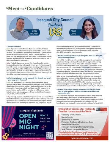 city councilmember would be to continue Issaquah’s leadership in balancing development with environmental conservation, ensuring our growth maintains our beloved open spaces while providing affordable housing for our community. 3. What leadership qualities do you bring that make you the right choice for this position? Chris: With over 20 years of leadership, management, and financial experience, I bring a steady and results-driven approach to serving Issaquah. I’ve served as Chair of the City’s Economic Vitality Commission for the past five years, serve on the Kiwanis Club board, and am Treasurer and Trustee for the Issaquah Highlands Council and Vice Chair of the City’s Strategic Plan Task Force. I am committed to listening carefully, collaborating openly, and working diligently to deliver thoughtful solutions that reflect our community’s values. Kelly: As your city councilmember, I bring a listening ear, strong work ethic, and creative problem-solving ability. I hear your concerns about affordability, traffic, and public safety. I’m committed to finding real solutions for Front Street and SR 900, and to ensuring our community remains a safe place to raise a family. And, I’ll ask tough questions to ensure that we can be proud of what we’ve done in 20, 50, and 100 years. 4. In your view, what’s the most important step the city should take to build resilience against emergencies and keep our community safe? Chris: The most important step Issaquah can take to build resilience is to proactively strengthen our infrastructure and emergency preparedness. This means investing in our first responders, upgrading communication systems, and empowering residents with the knowledge to stay prepared. I am proud to be endorsed by Local IAFF