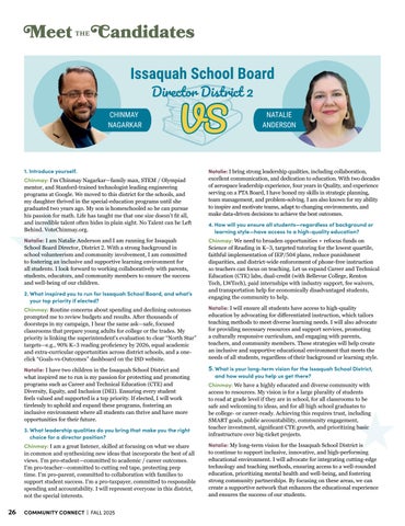 1. Introduce yourself. Chinmay: I'm Chinmay Nagarkar—family man, STEM / Olympiad mentor, and Stanford-trained technologist leading engineering programs at Google. We moved to this district for the schools, and my daughter thrived in the special-education programs until she graduated two years ago. My son is homeschooled so he can pursue his passion for math. Life has taught me that one size doesn’t fit all, and incredible talent often hides in plain sight. No Talent can be Left Behind. VoteChinmay.org. Natalie: I am Natalie Anderson and I am running for Issaquah School Board Director, District 2. With a strong background in school volunteerism and community involvement, I am committed to fostering an inclusive and supportive learning environment for all students. I look forward to working collaboratively with parents, students, educators, and community members to ensure the success and well-being of our children. 2. What inspired you to run for Issaquah School Board, and what’s your top priority if elected?