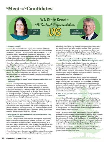a legislator, I worked across the aisle to deliver results. As a teacher, I’ve seen firsthand how policy impacts families. These experiences give me the perspective and integrity to represent our district and restore balance in Olympia, highlighted by my seven Seattle Times endorsements and consistent Outstanding ratings from the Municipal League of King County. 4. What is your long-term vision for Legislative District 5, in particular Issaquah, and how does it fit into Washington’s future? Victoria: I envision the 5th Legislative District and Issaquah as sustainable, connected, and inclusive, with affordable housing, strong public schools, beautiful natural areas, and accessible services to support our communities’ needs. This aligns with Washington’s broader future of resilience, environmental leadership, and economic opportunity for everyone. By working together with the community, I believe we can make this future a reality. Chad: My long-term vision for the 5th District is a community where families can afford to live, work, and thrive. For Issaquah, that means reducing taxes and mandates, supporting local businesses, and ensuring schools partner with parents to prepare students for tomorrow’s jobs. Our district can be a model for Washington’s future by balancing smart growth with quality of life. I will work to ensure Olympia invests here and supports sustainable, family-friendly communities across the state. 5. What do you see as the most pressing issue facing our district right now? Victoria: Cost of living in our area, especially cost of housing, is a pressing challenge and one that I hear about when I talk to folks at their homes across the district. We need to have more options for affordable housing, and reliable ways to get around and to get to and from work. I’m focusing on addressing these challenges, investing in transportation and infrastructure, and balancing growth with the unique needs of each community. Chad: The most pressing issue is affordability. Families are being squeezed by rising costs for housing, groceries, and gas, while Olympia keeps raising taxes and offering the same costly “solutions” that haven’t worked. Critical projects like Highway 18 are still delayed, and daily life is getting more and more expensive for residents. My focus is restoring fiscal responsibility and finding smarter solutions that ease costs and deliver real results for families in the 5th District. Candidate statements not edited by Highlands Council. For full answers from each candidate, visit issaquahhighlands.com/ general-election-candidates-2025.
