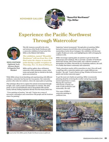 Capturing “natural monuments” through plein air painting, Miller learned to immerse herself fully in her surroundings under the mentorship of artist Alvaro Castagnet. Her exhibition will showcase roughly 20 plein air works, each highlighting her skill in bringing the outdoors to life. Miller encourages aspiring plein air painters to get involved with local groups and workshops. She is currently a member of Northwest Watercolor Society, Mt Si Artist Guild, and a collective member of Snoqualmie Art Gallery. Beyond the joy of painting outdoors, she said, it’s a hobby that fosters community and connection. “Parks, attractions nearby will be somewhere to start. [You will need] a small bag with a watercolor palette and a couple different size brushes,” she said. “I used a Darsie art bag, Windsor & Newton travel palette and Arches watercolor paper.” To get the most out of plein air painting, Miller recommends planning ahead by reviewing the weather and giving yourself uninterrupted time to create. Sharing the experience with friends or family can make it both productive and memorable, she said. View some of Miller’s watercolor paintings at ymillerart.com.