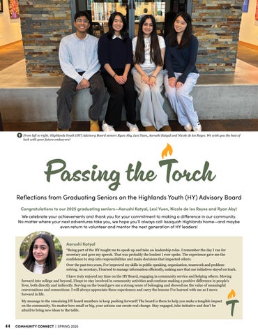 The Highlands Youth (HY) Advisory Board is now accepting applications for the 2025–26 year. If you’re a student in grades 7–12 looking for a meaningful way to get involved, this is your chance to make a real impact in the Issaquah Highlands community. Discover the lasting effect of HY seniors as they reflect on their experiences and growth over the years on pages 44–45.