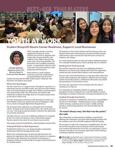 Building from the Ground Up Riya said the nonprofit’s early days were challenging. Emails to businesses went unanswered, students didn’t know the organization existed and early outreach efforts failed to reach interested teens. However, Riya viewed Youth4LOCAL as a long-term effort rather than a quick school assignment. She designed a detailed outreach strategy, started social media activities, collaborated with teachers and refined her presentation to local business owners. Over time, the organization went from flying under the radar to standing out in a big way. Now, businesses are responding. Students are signing up without prompting. Parents are asking for ways to get their children involved. What began as a trial has evolved into a community learning hub for all.