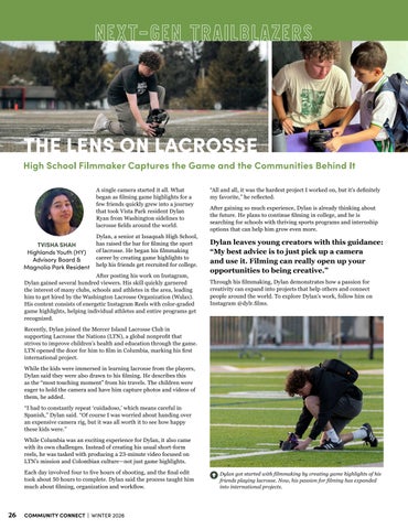 THE LENS ON LACROSSE High School Filmmaker Captures the Game and the Communities Behind It A single camera started it all. What began as filming game highlights for a few friends quickly grew into a journey that took Vista Park resident Dylan Ryan from Washington sidelines to lacrosse fields around the world.