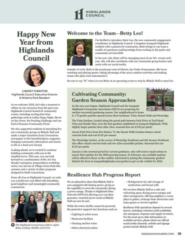 LINDSEY PINKSTON Highlands Council Executive Director & Wisteria Park Resident As we welcome 2026, let’s take a moment to reflect on our successes from the past year. Highlands Council hosted 65 community events, including exciting first-time gatherings such as Ladies Singo Night, Movie on the Green, the Puzzling Challenge and our End of Summer Community Picnic. We also supported residents in launching five new community groups at Blakely Hall and made a major transition from Connections newspaper to this beautiful glossy magazine, bringing community information and stories to life in a fresh new format. Looking ahead, we’re excited to continue building community with you in the neighborverse. This year, you can look forward to a continuation of the Are You Ready? emergency preparedness workshop series, two movies at Village Green Park this summer and a variety of other programs designed to build connections. From all of us at Highlands Council, we wish you a joyful new year filled with friendship, good neighbors and meaningful community connections.