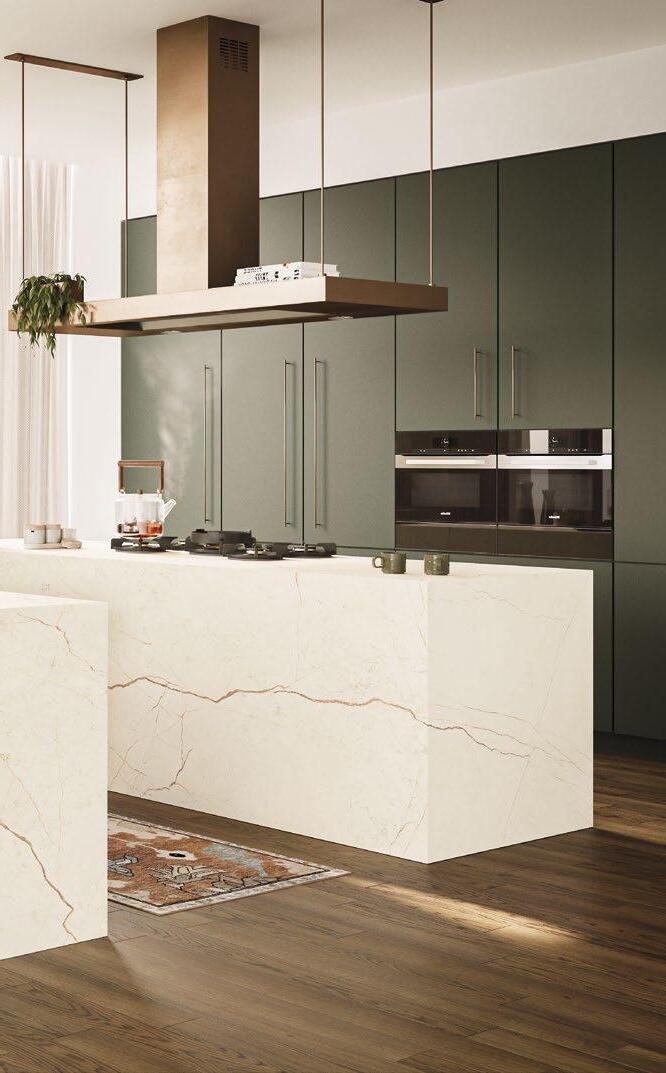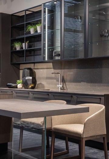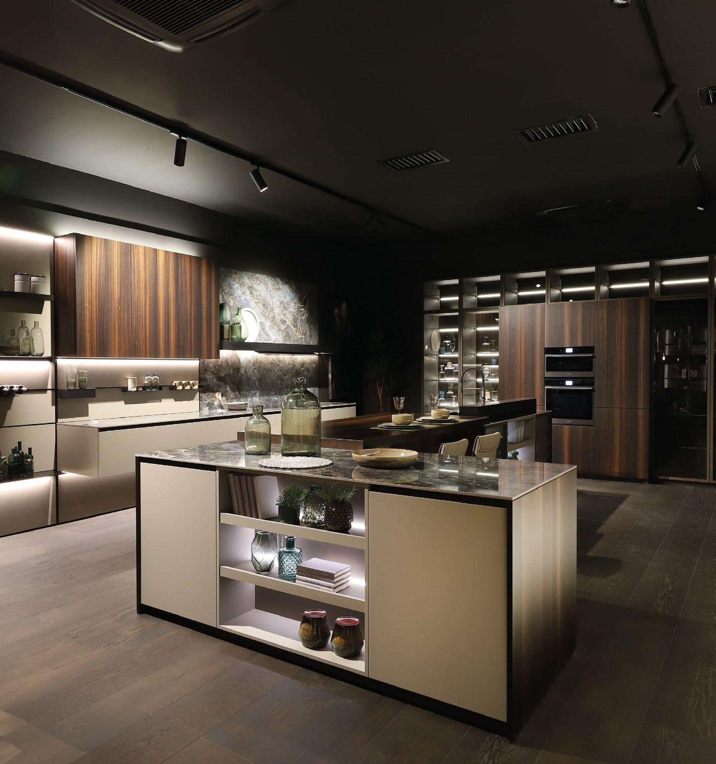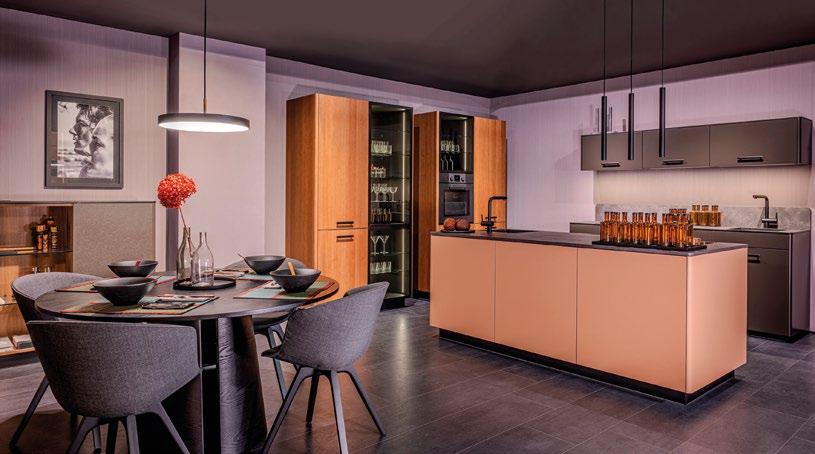 Sachsenküchen showcases a super sleek island styled in the subtle new walnut, paired with a slimline Dekton Laurent worksurface for the ultimate contemporary look. Luxury glass storage is presented with Fabiola book-matched new Elm cinnamon cabinetry and Selma –
