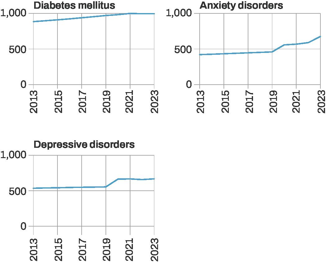 Between 2013 and 2023, there were sharp increases in healthy years lost due to diabetes and anxiety and depressive disorders.