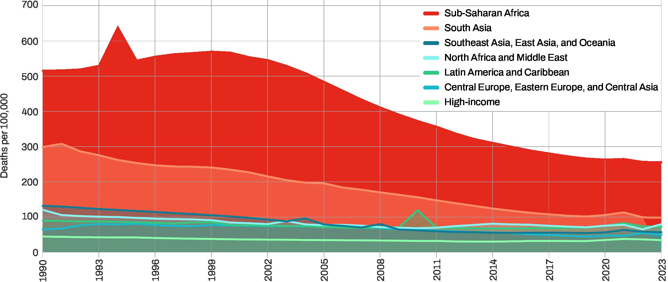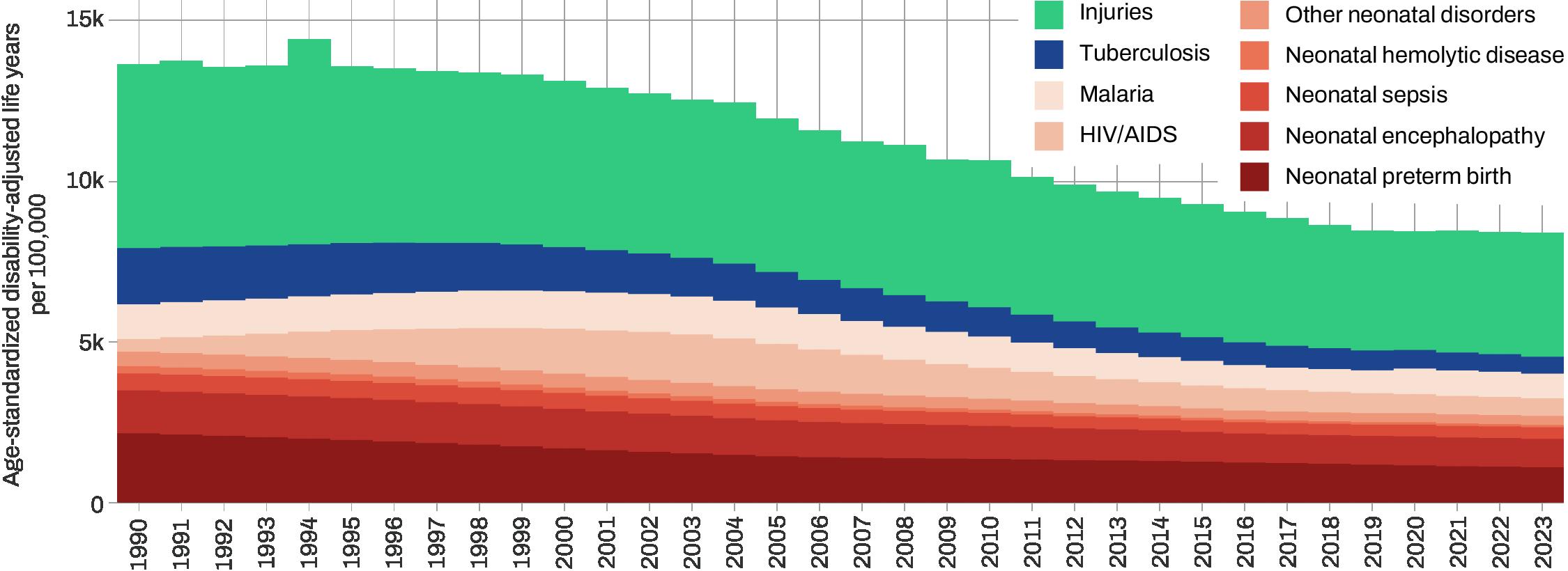 Healthy years lost due to injuries, tuberculosis, malaria, HIV/AIDS, and newborn disorders (age-adjusted), 1990–2023