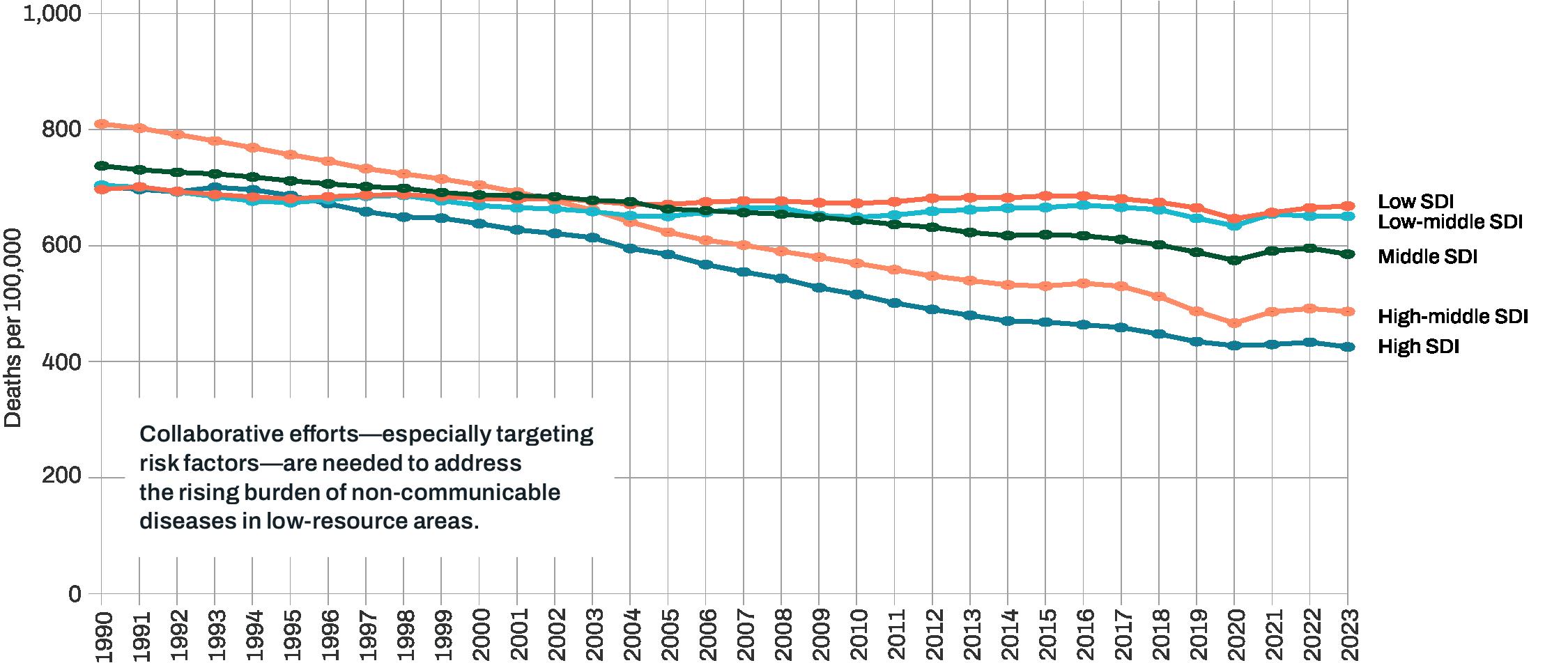 While mortality from non-communicable diseases is dropping steadily in areas with higher Socio-demographic Index (SDI) levels, it remains stubbornly high in low SDI countries.