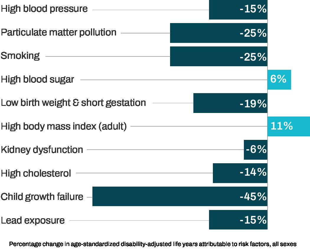 Health loss from high blood sugar and high body mass index is rising, but for many other risk factors it is dropping.