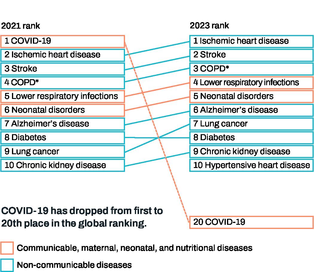 After killing 18 million people, COVID-19 dropped from the leading cause of death worldwide in 2021 to the 20th-leading cause in 2023.