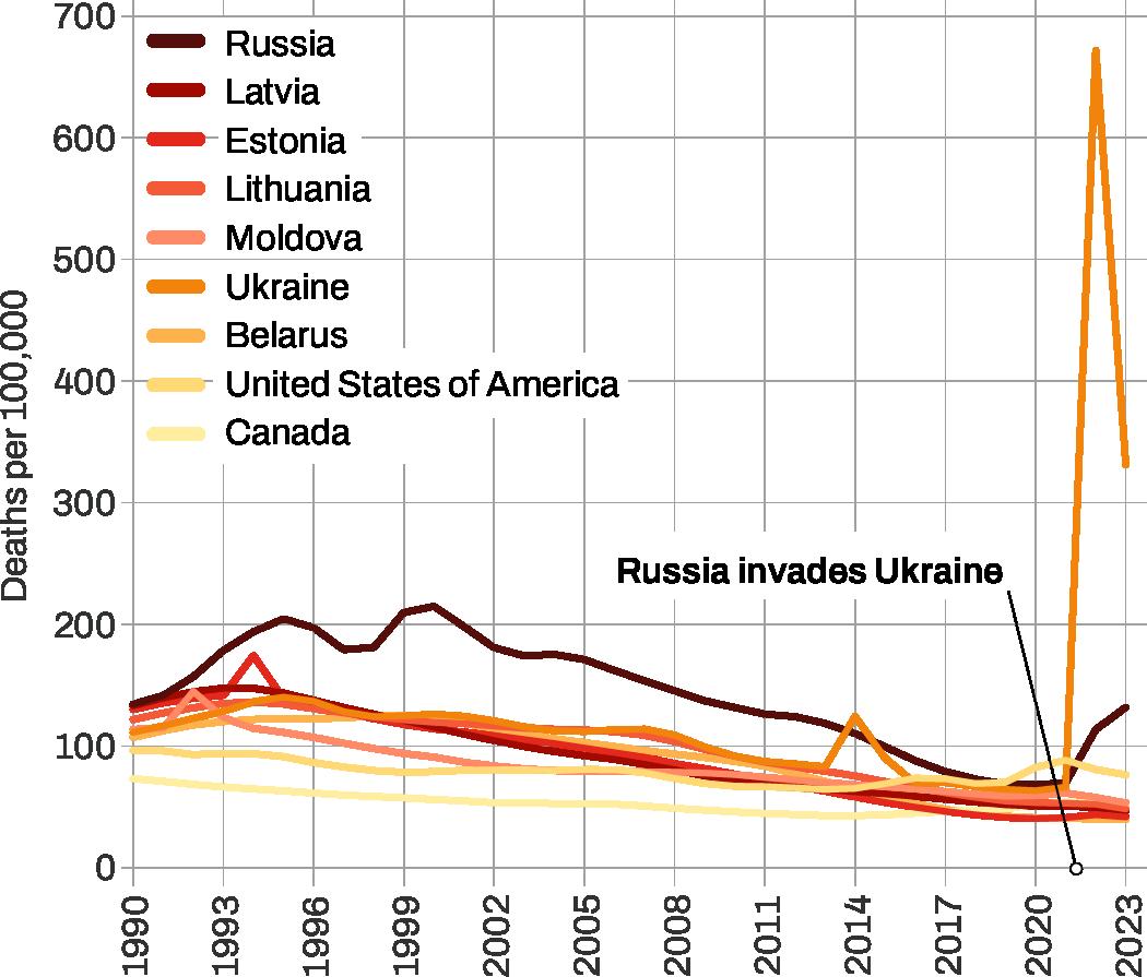 Mortality among those aged 15–24 years (deaths per 100,000 people) in Eastern European countries, the US, and Canada, 1990–2023