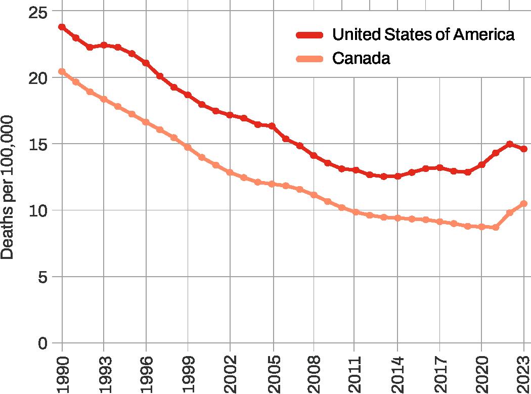 Mortality among children ages 5–14 (deaths per 100,000 people) in the US and Canada, 1990–2023