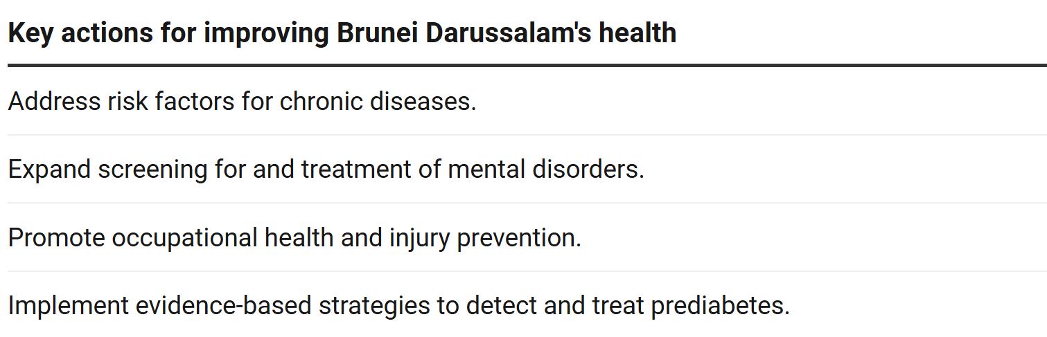 What drives poor health and early death in Brunei Darussalam? Diabetes/high blood sugar, cardiovascular diseases, and musculoskeletal disorders rank among the top health problems and risk factors.