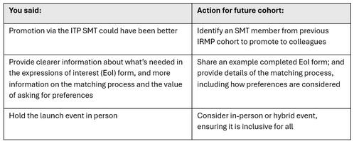 The feedback from ITP IRMP participants was overwhelming positive, and the coordinators were keen to launch a second round, having already heard interest expressed from colleagues who had not been able to participate in cohort 1.