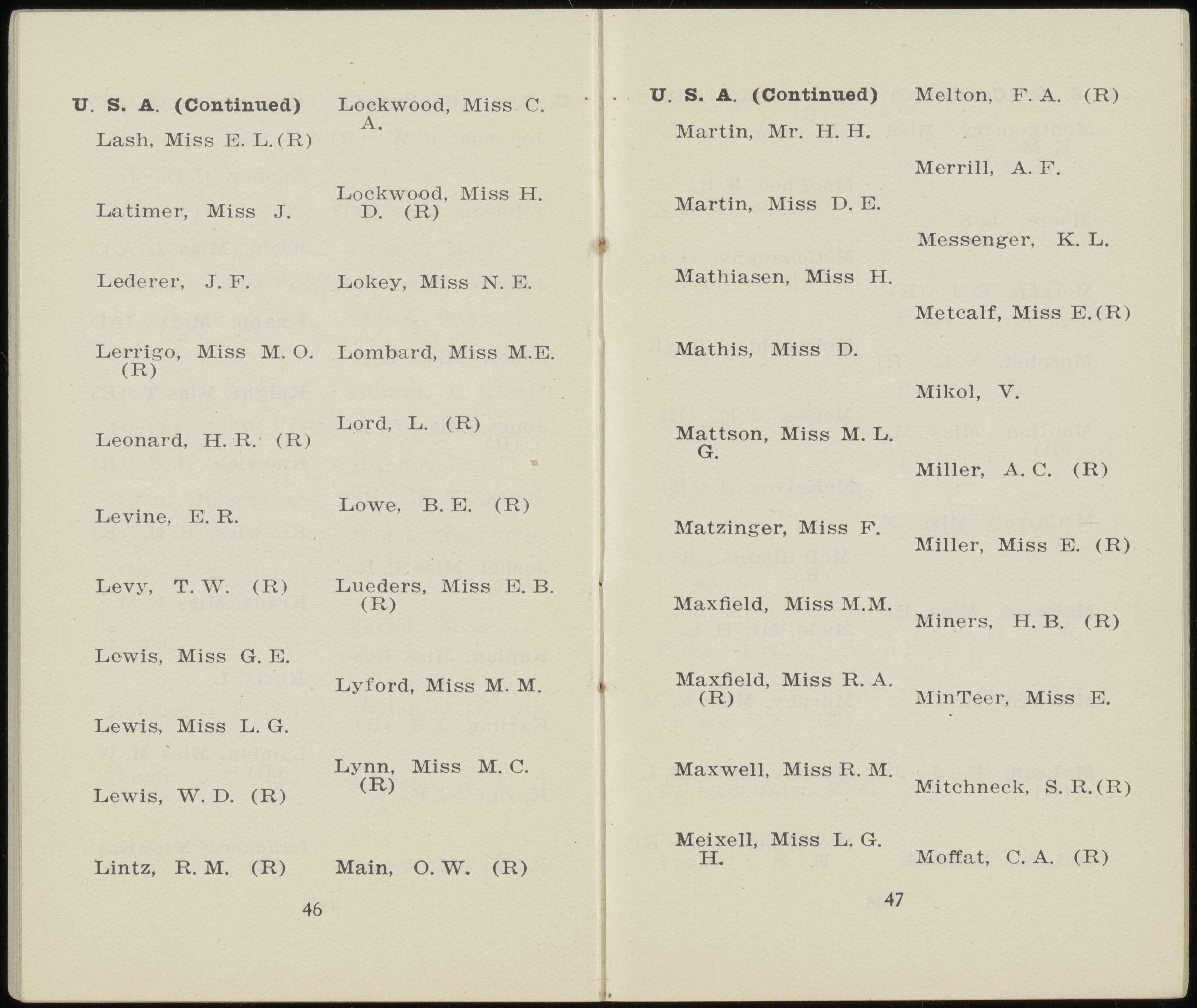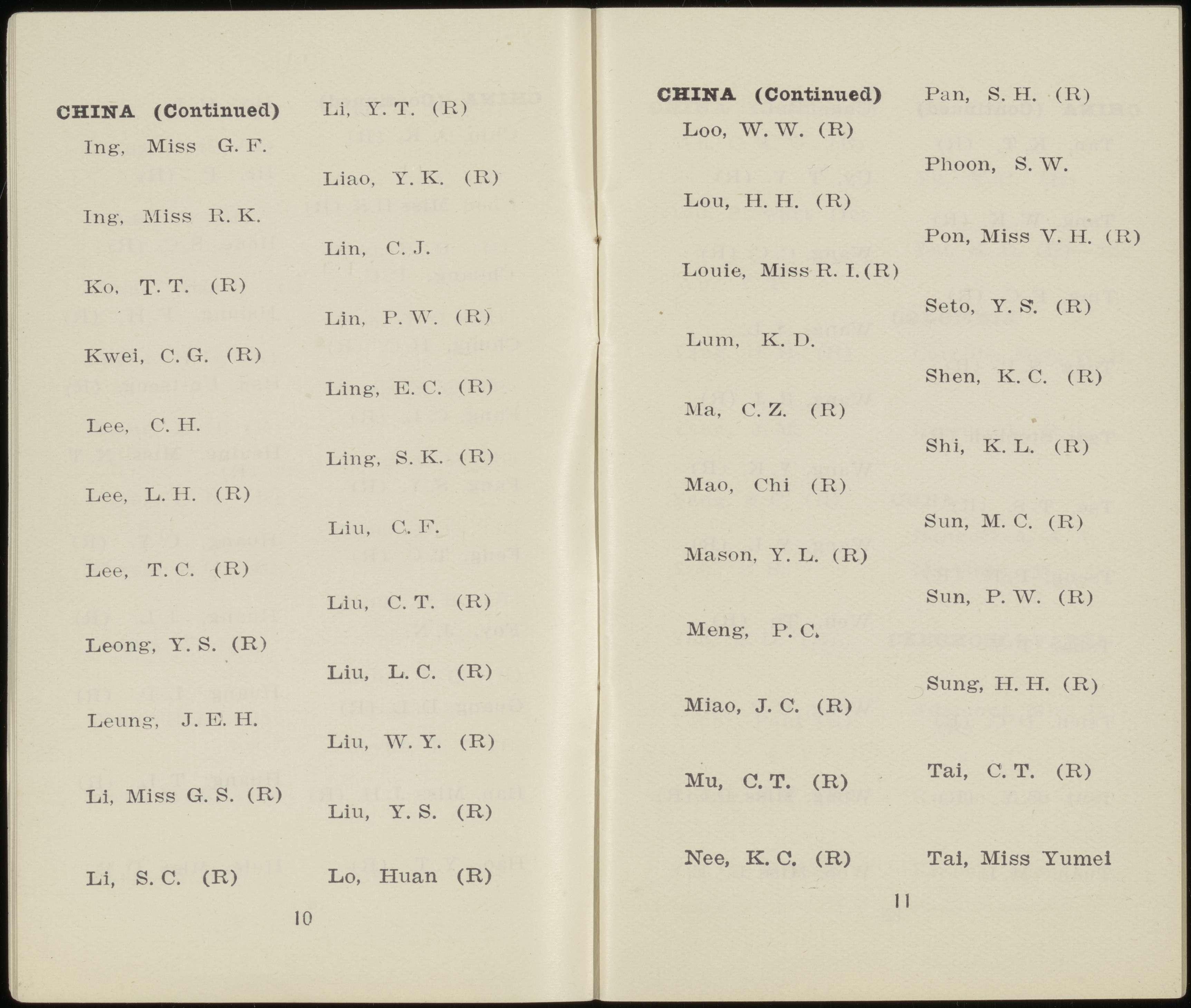The Intercollegiate Cosmopolitan Club was founded in the City of New York in 1910 and grew from a small membership in that year to one of over 800 in 1920, the year International House was first definitely projected. This membership continued until 1924, when the House was opened, after which it increased to 1500. The total membership for the first fifteen years numbers about 4000, and the following list includes about 3000 and is being published at the suggestion of a large number of recent members who believe that it will facilitate correspondence, help those who are traveling, as well as be of practical value in years to come in compiling and keeping up to date the membership of an expanding world-wide movement.