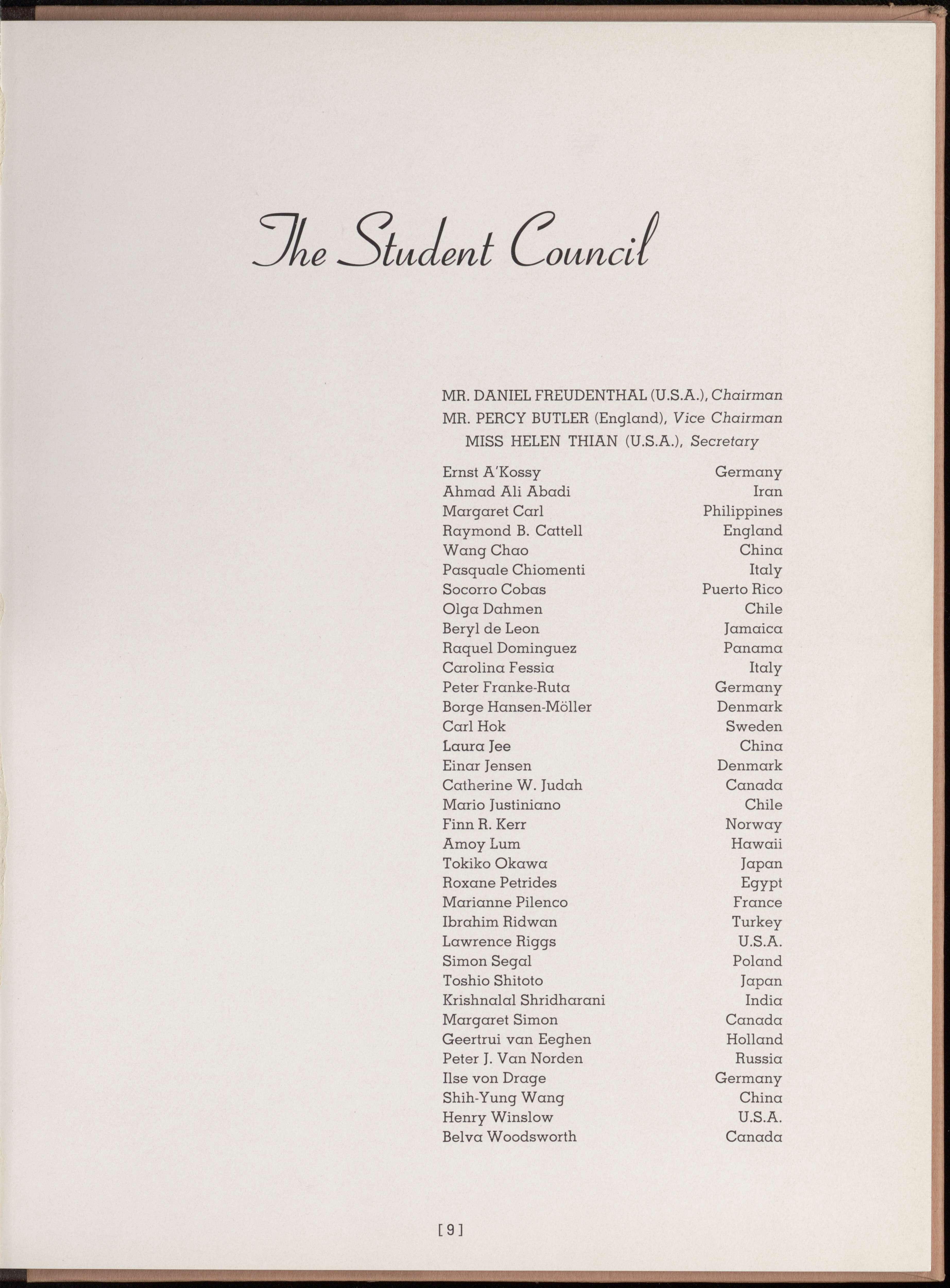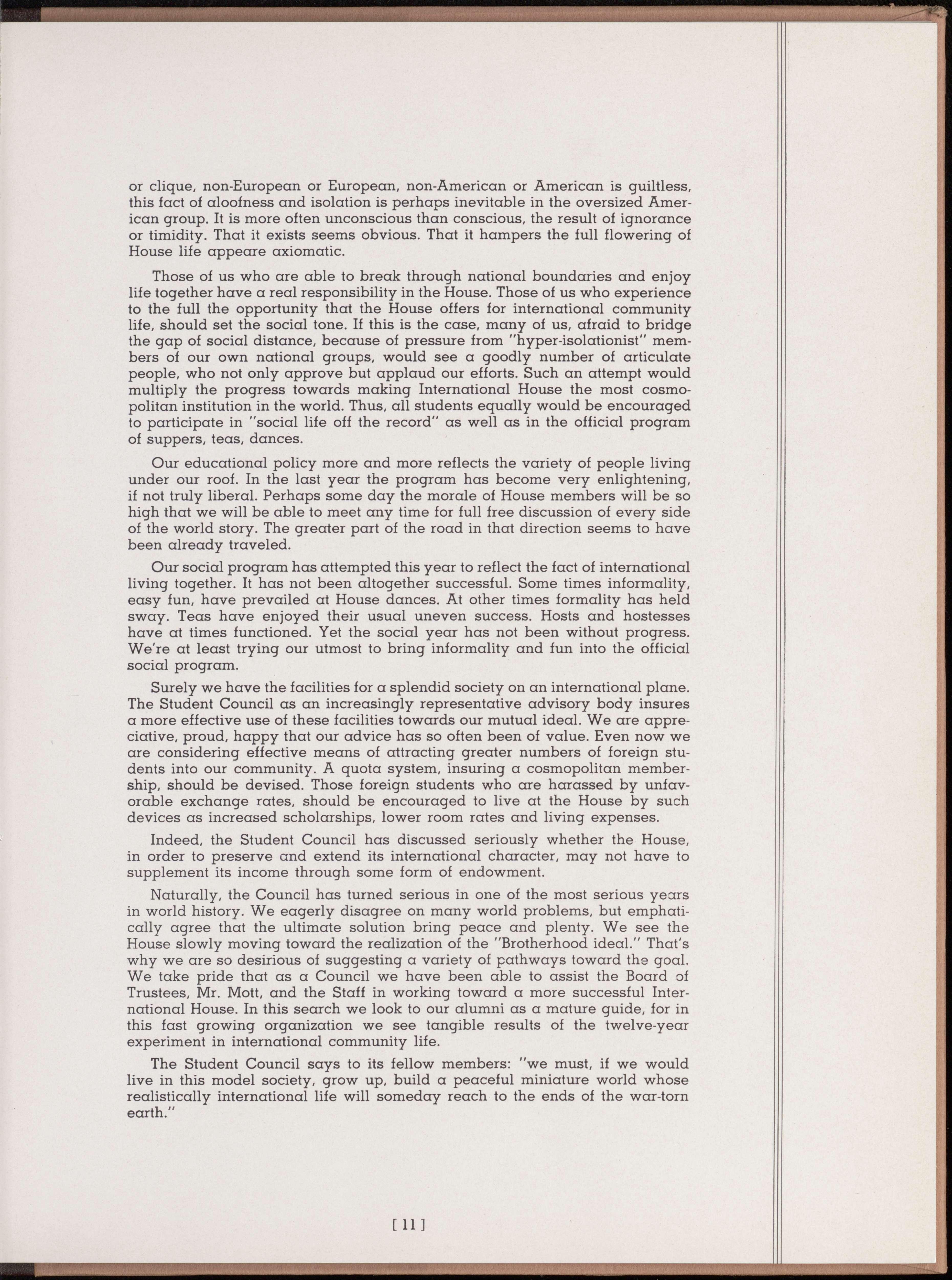 Surely we have the facilities for a splendid society on an international plane. The Student Council as an increasingly representative advisory body insures a more effective use of these facilities towards our mutual ideal. We are appreciative, proud, happy that our advice has so often been of value. Even now we are considering effective means of attracting greater numbers of foreign students into our community. A quota system, insuring a cosmopolitan membership, should be devised. Those foreign students who are harassed by unfavorable exchange rates, should be encouraged to live at the House by such devices as increased scholarships, lower room rates and living expenses.