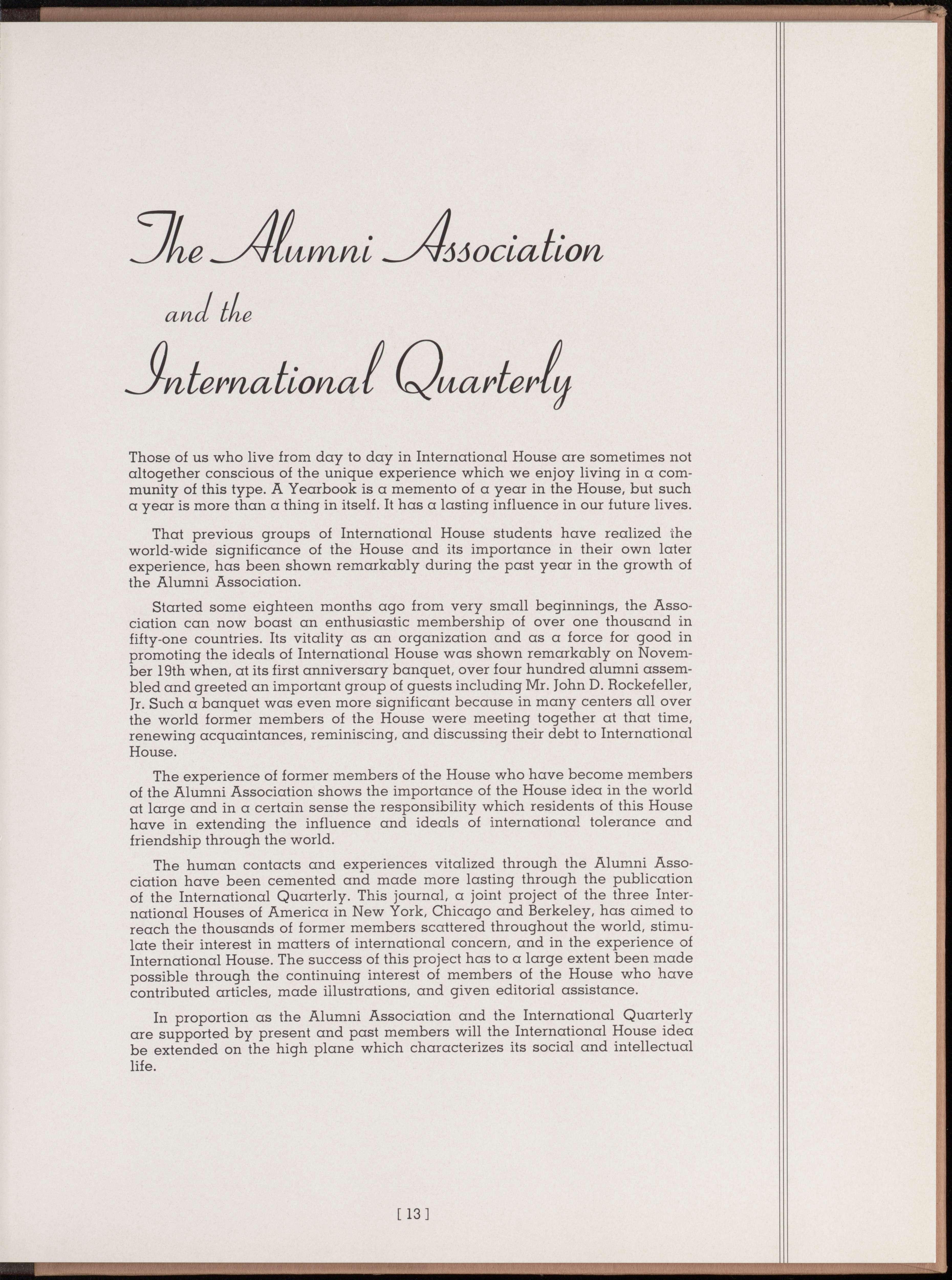 Started some eighteen months ago from very small beginnings, the Association can now boast an enthusiastic membership of over one thousand in fifty-one countries. Its vitality as an organization and as a force for good in promoting the ideals of International House was shown remarkably on November 19th when, at its first anniversary banquet, over four hundred alumni assembled and greeted an important group of guests including Mr. John D. Rockefeller, Jr. Such a banquet was even more significant because in many centers all over the world former members of the House were meeting together at that time, renewing acquaintances, reminiscing, and discussing their debt to International House.
