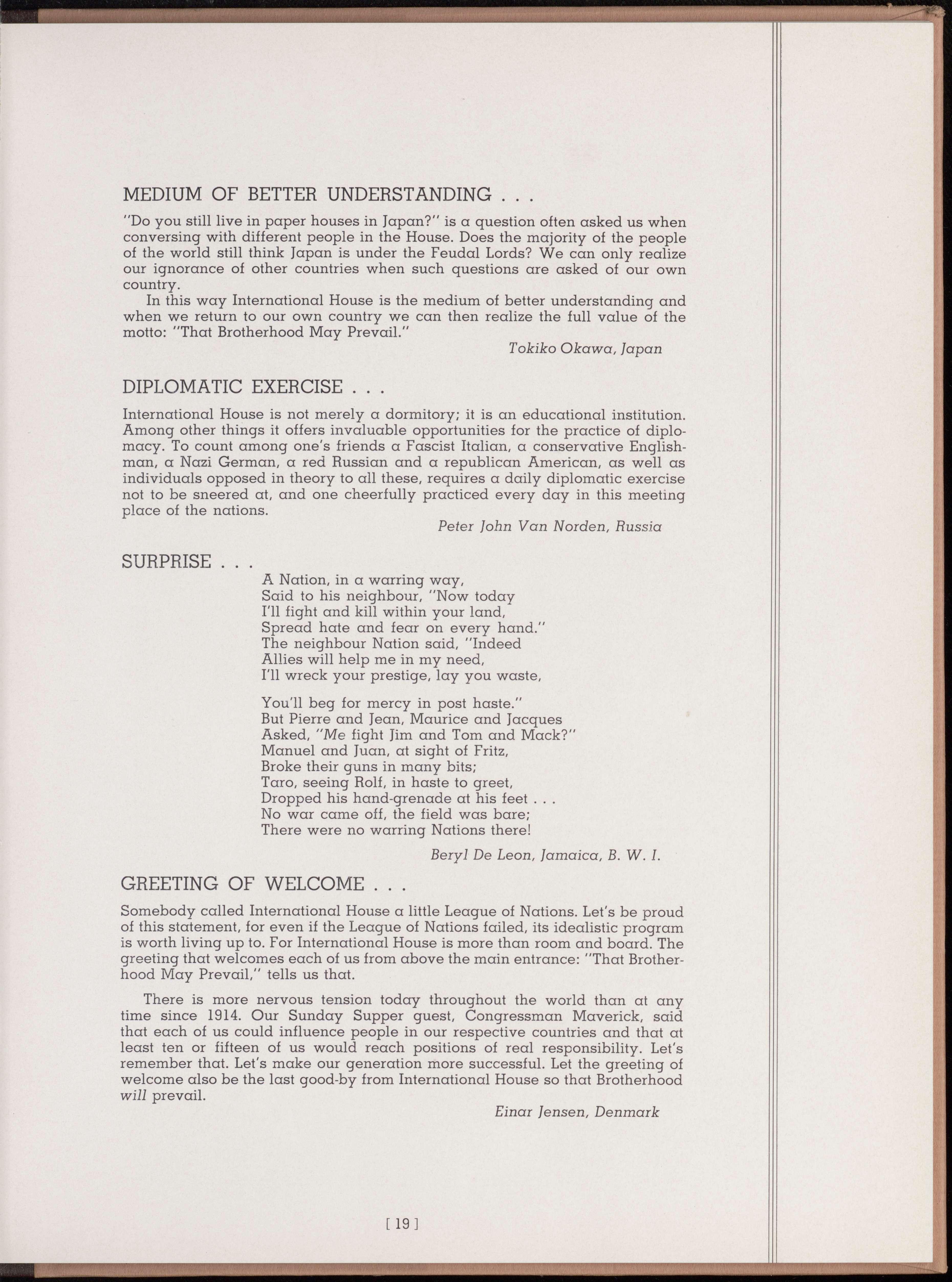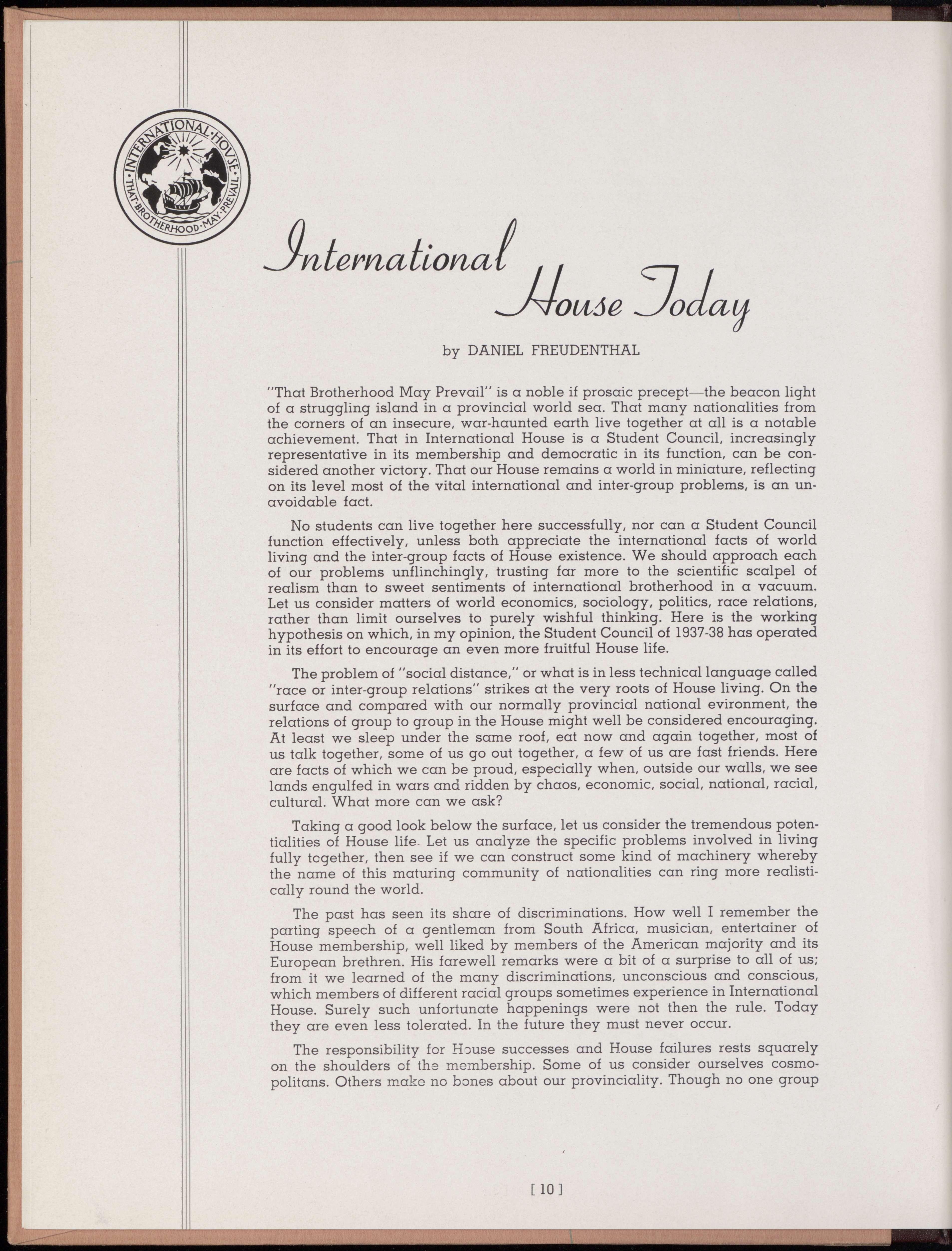 That Brotherhood May Prevail” is a noble if prosaic precept—the beacon light of a struggling island in a provincial world sea. That many nationalities from the corners of an insecure, war-haunted earth live together at all is a notable achievement. That in International House is a Student Council, increasingly representative in its membership and democratic in its function, can be considered another victory. That our House remains a world in miniature, reflecting on its level most of the vital international and inter-group problems, is an unavoidable fact.
