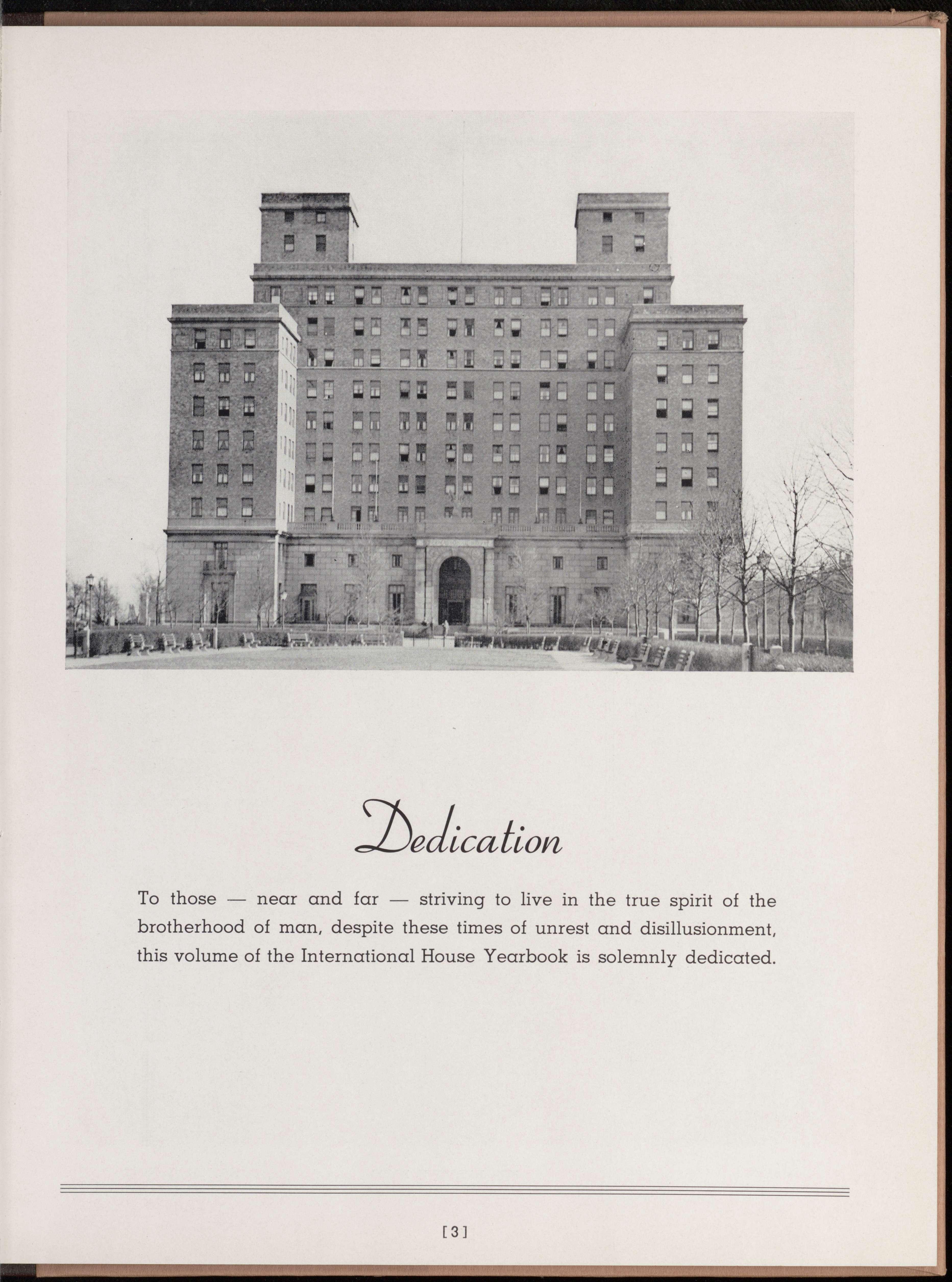 To those — near and far — striving to live in the true spirit of the brotherhood of man, despite these times of unrest and disillusionment, this volume of the International House Yearbook is solemnly dedicated.