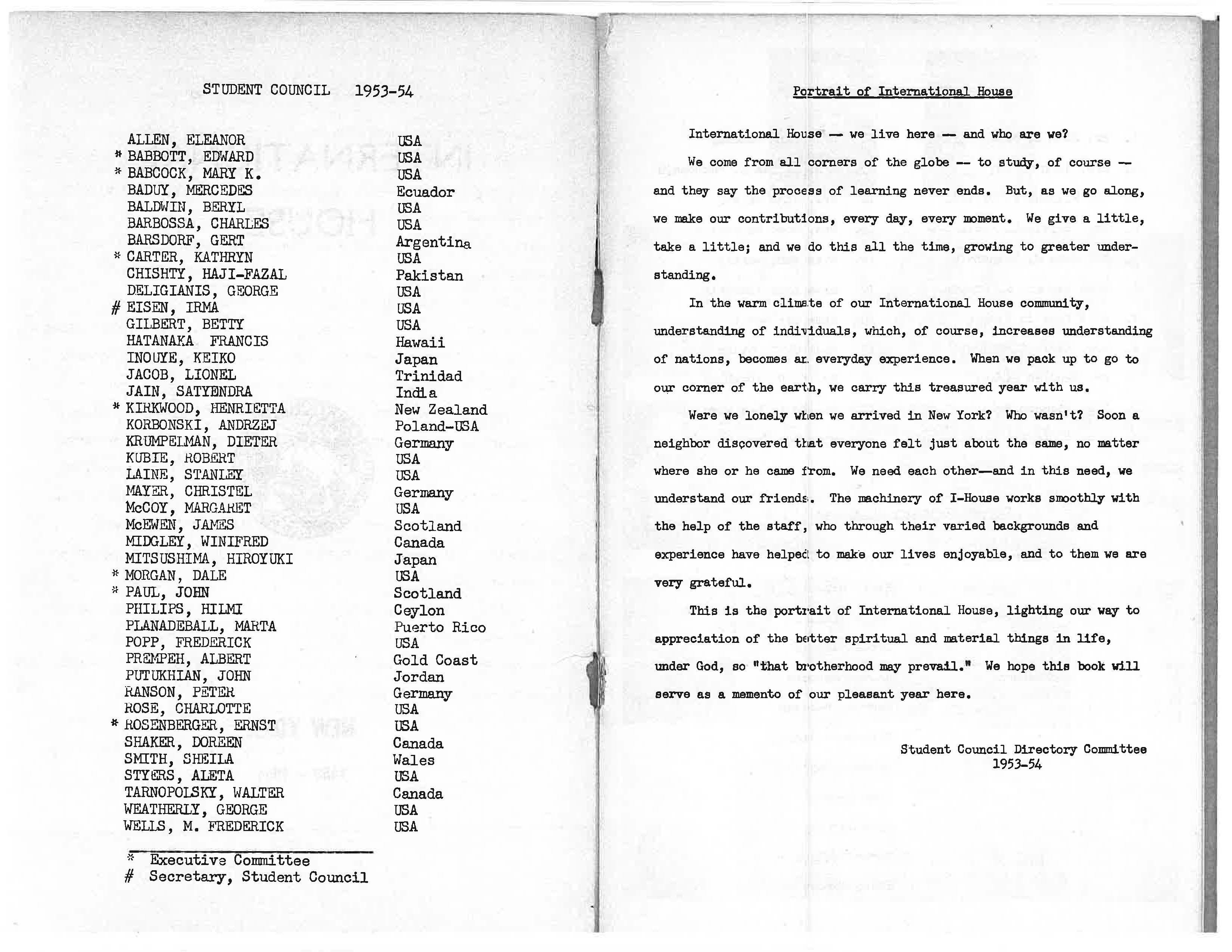 Were we lonely when we arrived in New York? Who wasn't? Soon a neighbor discovered tbat everyone felt just about the same, no matter where she or he came from. We need each other-and in this need, we understand our friends,. The machinery of I-House works smoothly with the help of the staff, who through their varied backgrounds and experience have helped to make our lives enjoyable, and to them we are very grateful.