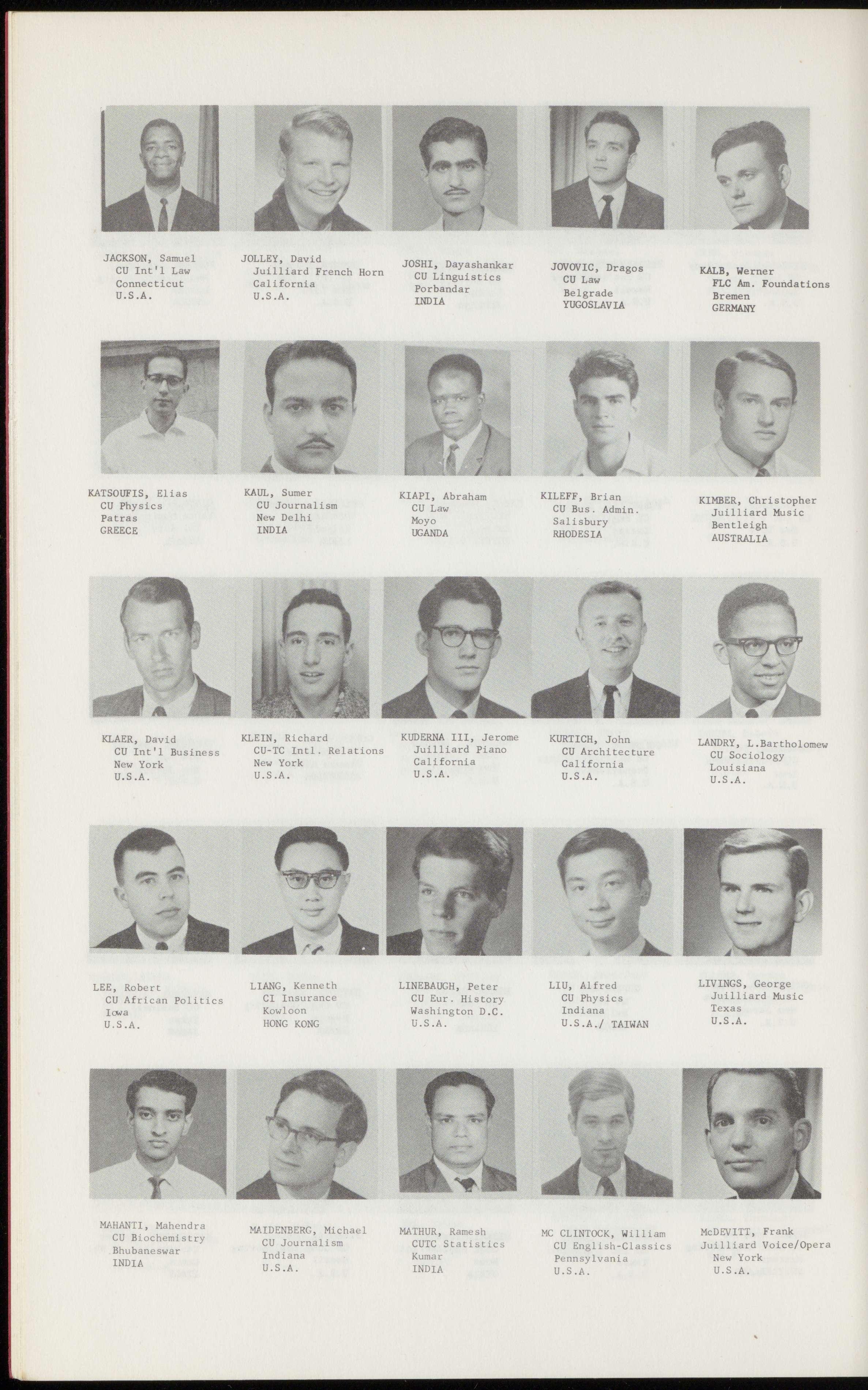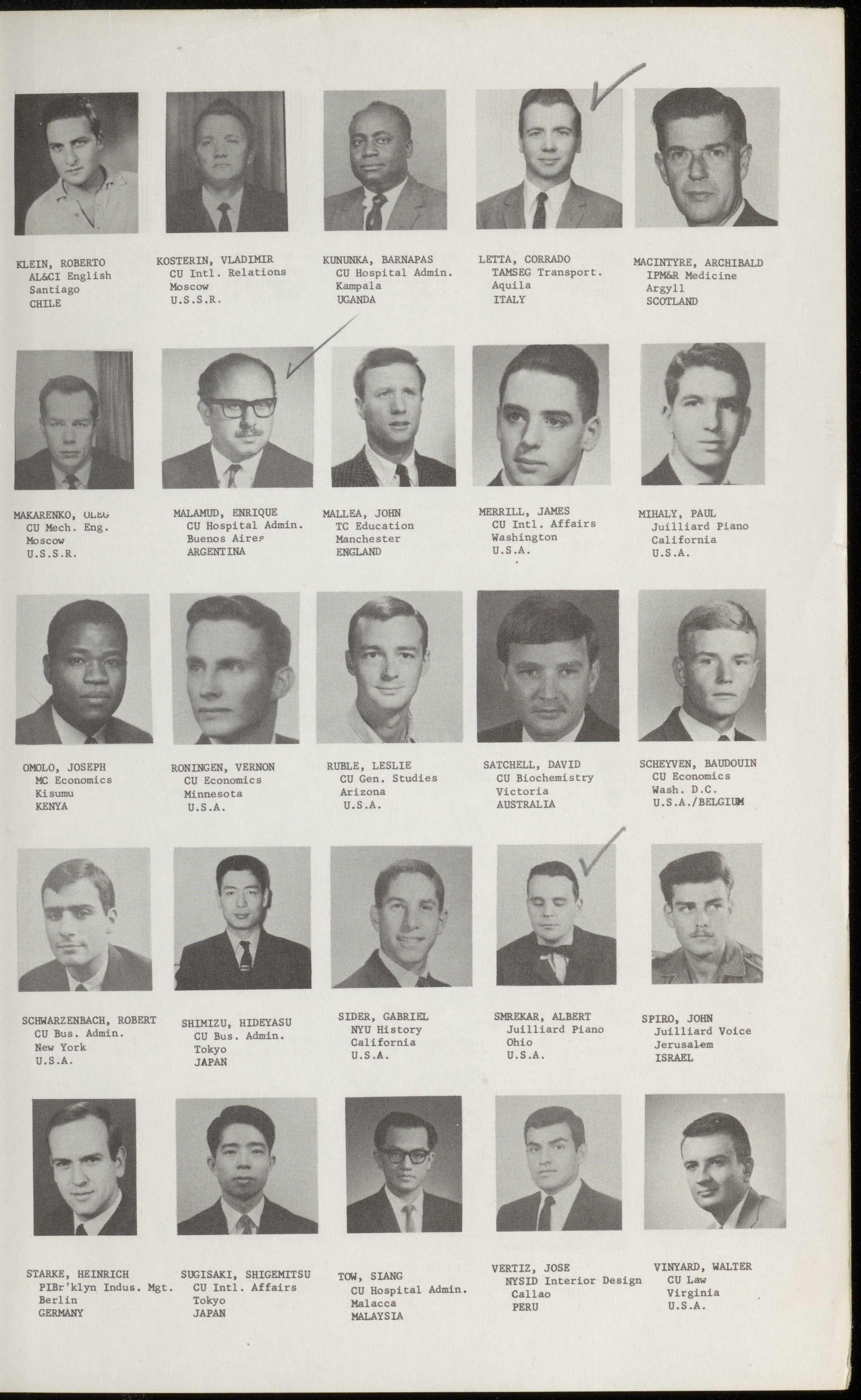 MAKARENKO, ULEG MALAMUD, ENRIQUE MALLEA, JOHN MERRILL, JAMES MIHALY, PAUL CU Mech. Eng. CU Hospital Admin. TC Education CU Intl. Affairs Juilliard Piano Moscow Buenos Aires Manchester Washington California U.S.S.R. ARGENTINA ENGLAND U.S.A. U.S.A.