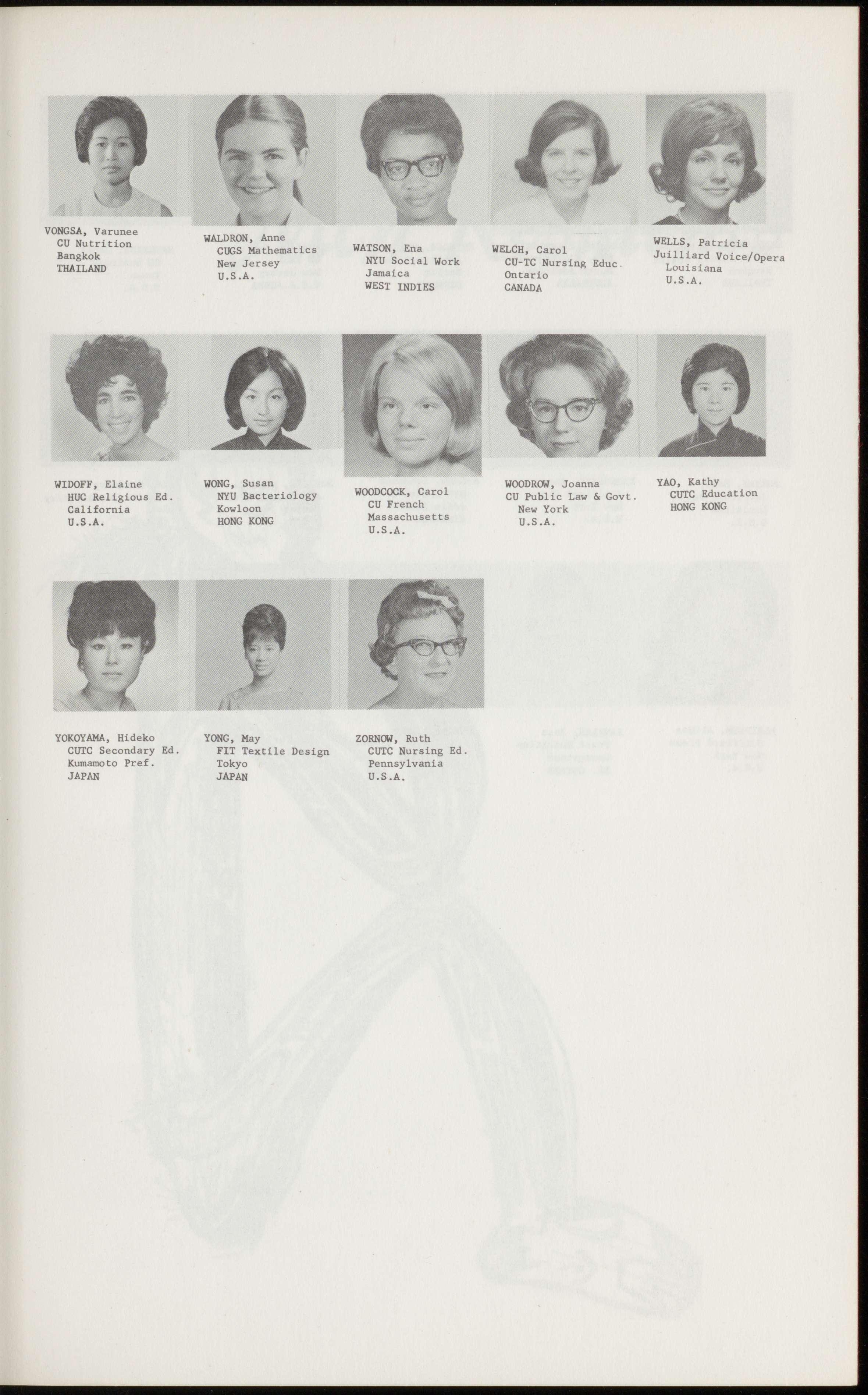 AKYUZ, Janet ALMEIDA, Cynthia ANDERMAN, Irene CU Nursing Educ. TC Educ. BIMC Biophysics Fordham Psychology CU Social Work Akropong-Akwapim Hawaii Vente Karachi California