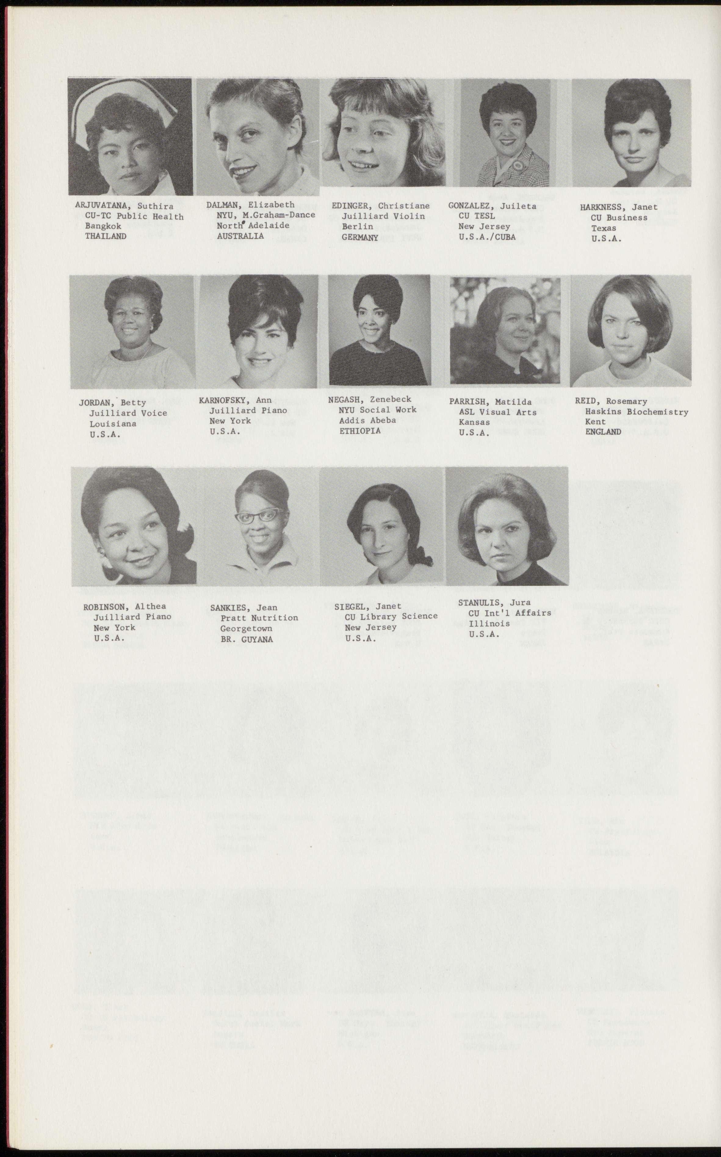 BANKS, Devonie BEAUPAIN, Therese BHASIN, Kamlesh Juilliard Conc. Pianc Juilliard Voice Manhattan Violin CU Sociology Chicago U. Sociology Buenos Aires Rhode Island Ohio Brussels Bombay ARGENTINA Urs::A. U.S.A. BELGIUM INDIA